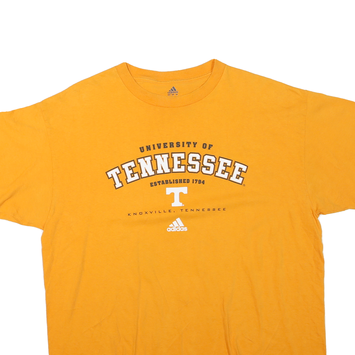 This Mens Adidas T-shirt features a vibrant orange colour with a prominent University of Tennessee graphic printed in white and black on the front. The text includes the phrases "University of Tennessee," "Established 1794," and "Knoxville, Tennessee," alongside the Adidas logo beneath. The fabric is a soft cotton blend, offering a comfortable and breathable wear.