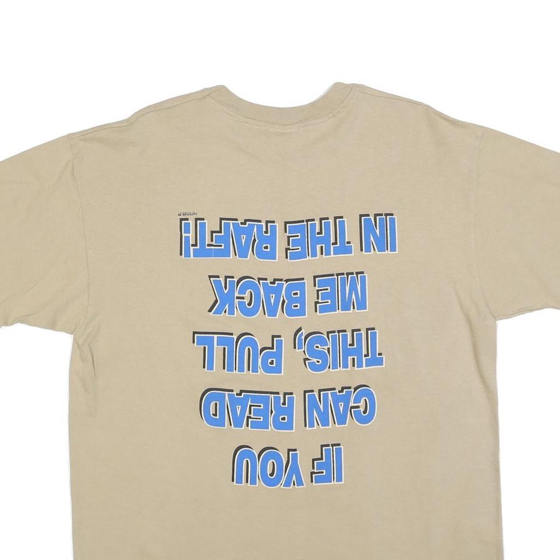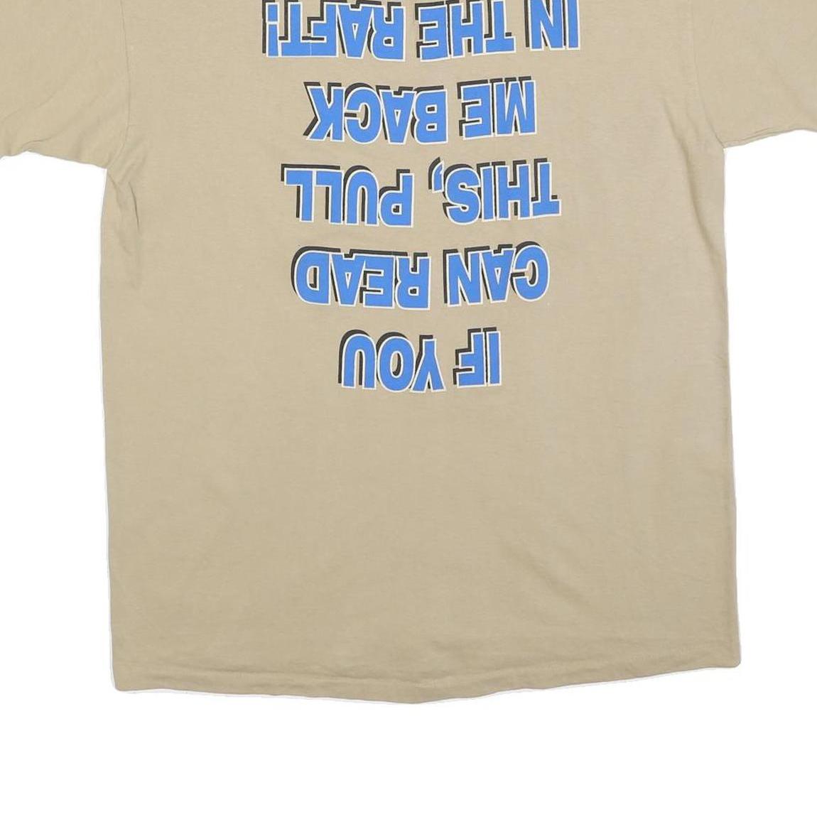 This beige ANVIL mens T-shirt features a small graphic on the front left chest showing a silhouette of two people paddling in a raft with "GALICE RESORT ROGUE RIVER" text beneath. The back of the shirt has a bold blue and black text print that reads "IF YOU CAN READ THIS, PULL ME BACK IN THE RAFT!" in a large, playful font.