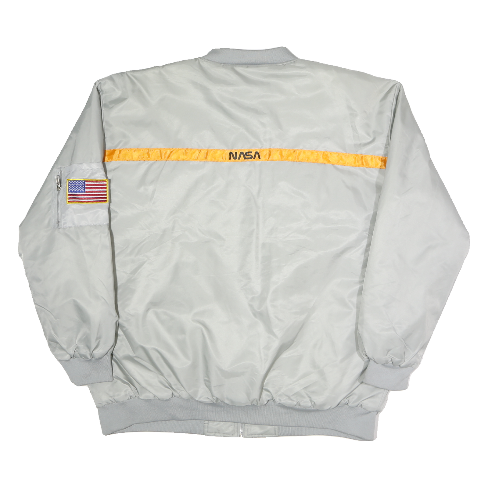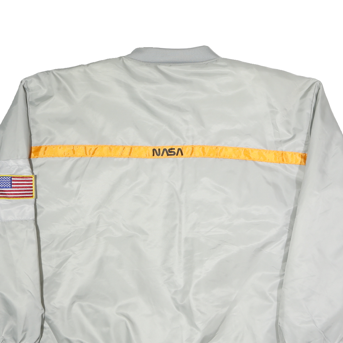 Crafted from smooth polyester, the jacket offers a slightly shiny finish and a lightweight feel. It has a relaxed fit with ribbed cuffs and hemline for a comfortable, snug fit. The collar is a soft band style and the front fastens with a central zip closure. On the back, an orange horizontal strip features the NASA name embroidered in black, with a detailed American flag patch on the sleeve pocket.
