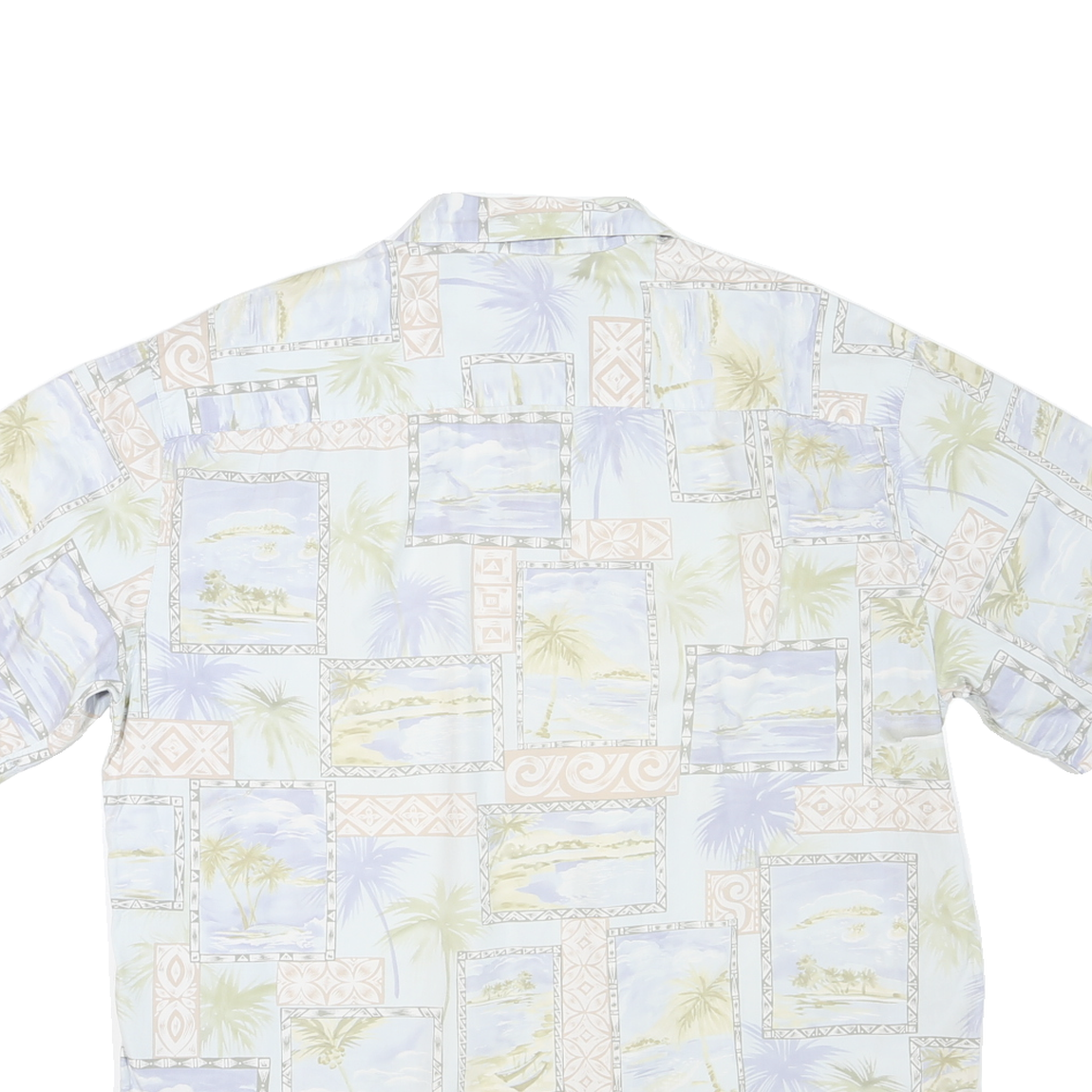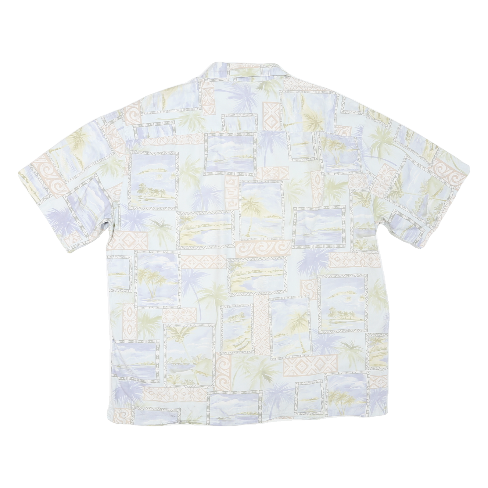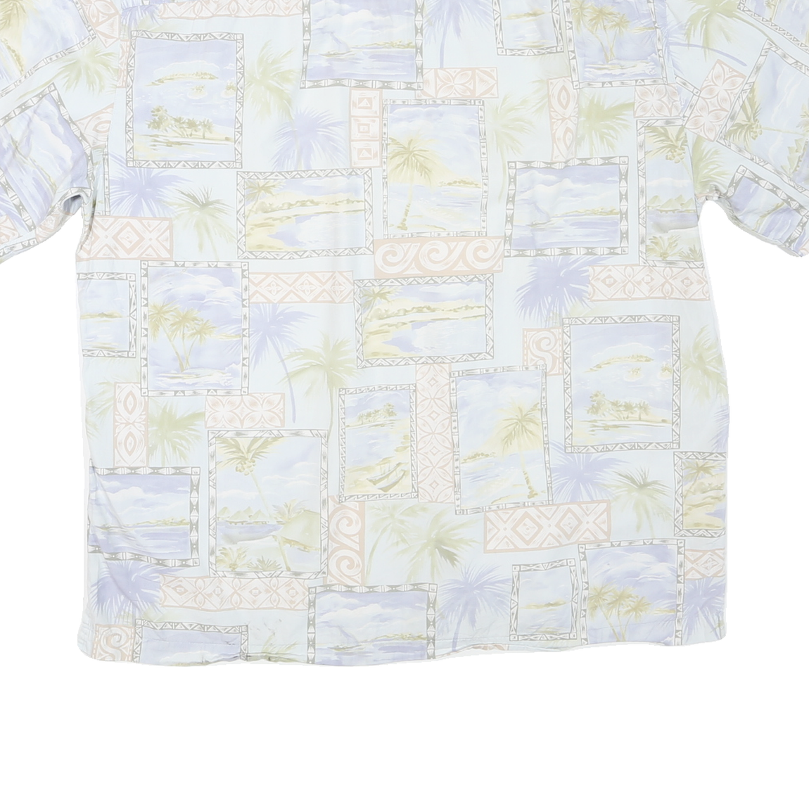 This Batik Bay mens shirt features a relaxed short sleeve design in soft cotton fabric, perfect for comfort in warm weather. The shirt is adorned with a repeating pattern of framed tropical scene prints in pastel blue, cream and soft beige hues, giving it a light and airy island holiday feel.