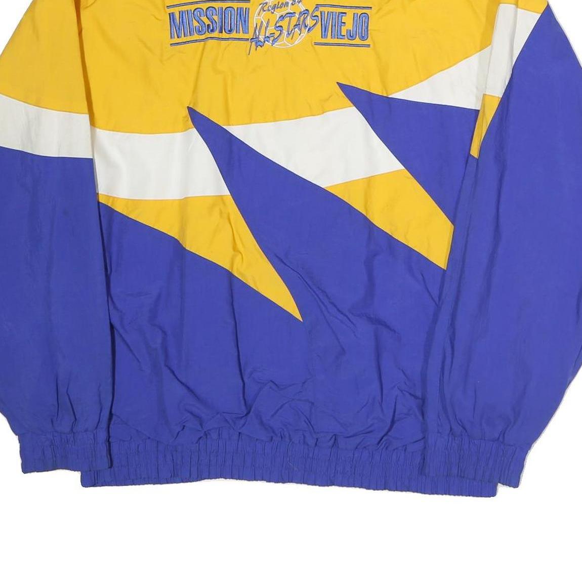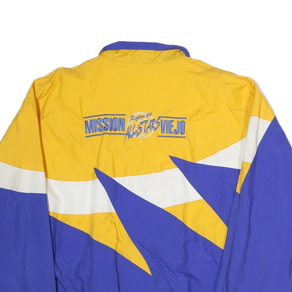This men's BAW jacket features a striking colourblock design in blue, yellow and white with a high collar and full zip front. The front sports a cursive embroidery of the name "Samantha," adding a unique personalised touch. The back displays bold graphic text reading "MISSION VIEJO ALLSTARS" with a basketball emblem, suggesting a sporty or team-inspired style.