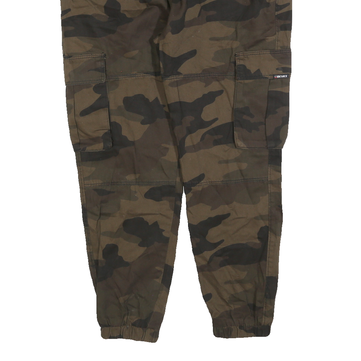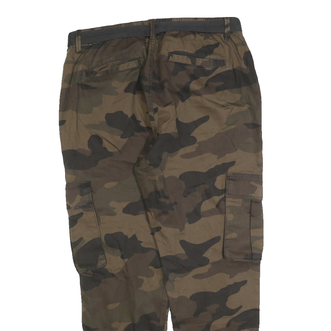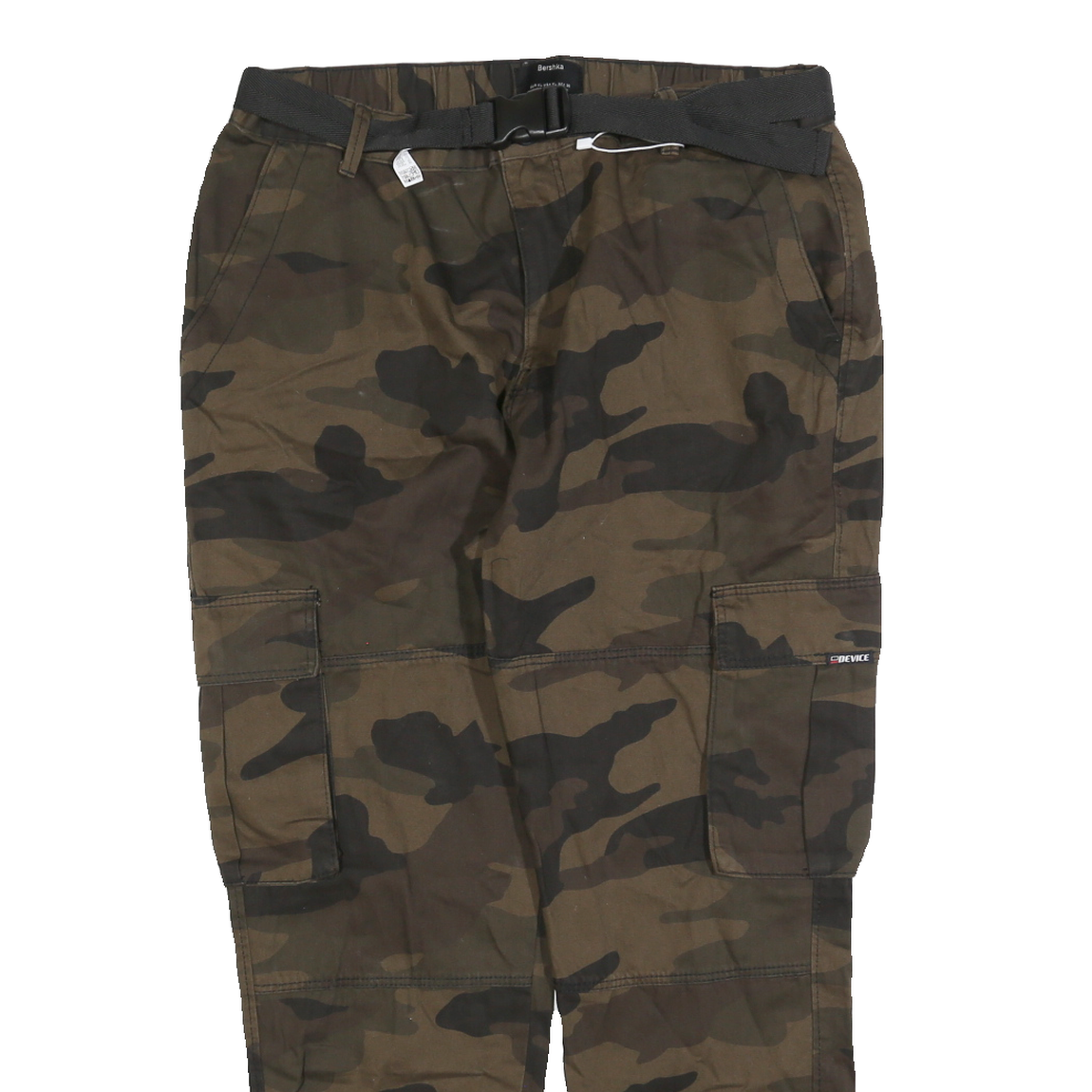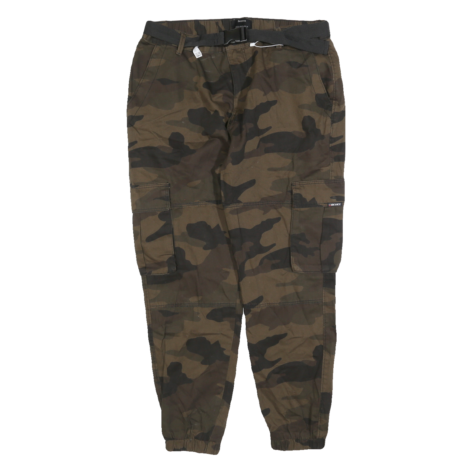 These BERSHKA womens cargo trousers feature a bold green and brown camouflage pattern, creating a distinctive urban look. They are equipped with side flap pockets and back welt pockets for practical storage and a black fabric belt at the waist for an adjustable fit. The elastic cuffed hems add a tapered finish to the legs.