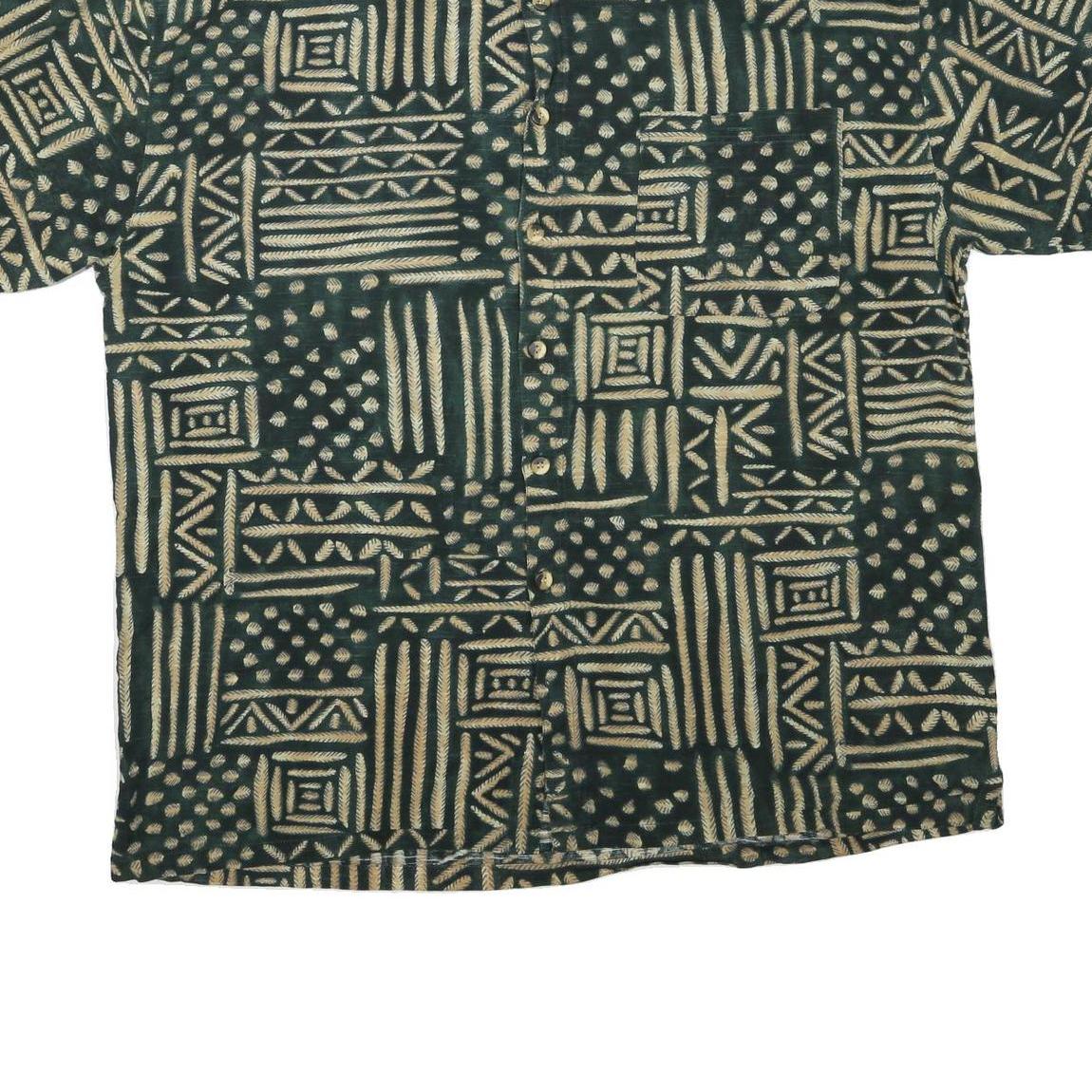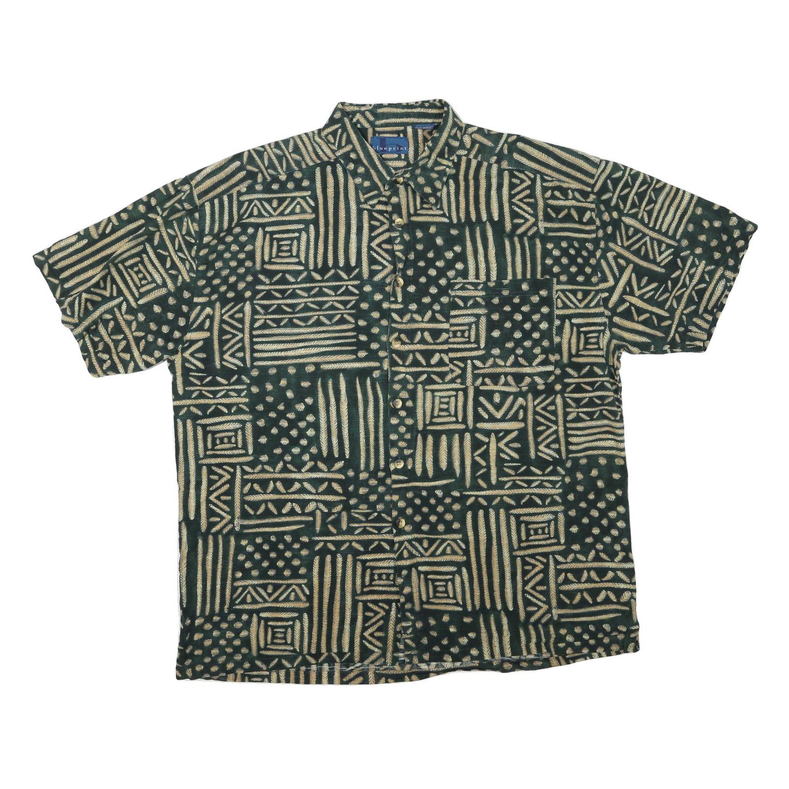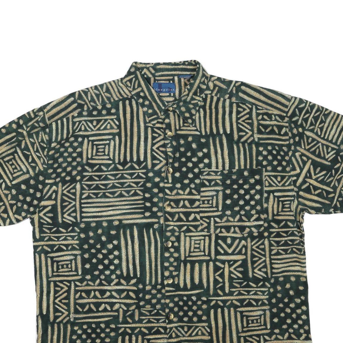 This Blue Print mens shirt features a striking geometric pattern in beige set against a dark green background, creating a bold and eye-catching design. The short sleeves and front button closure make it a comfortable, casual option for warmer days.