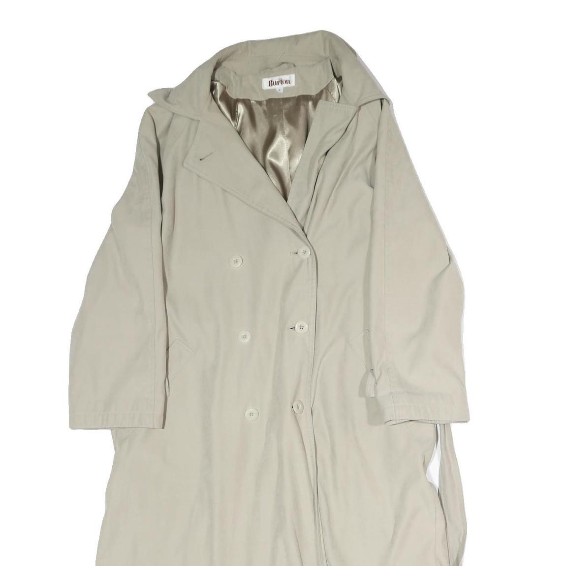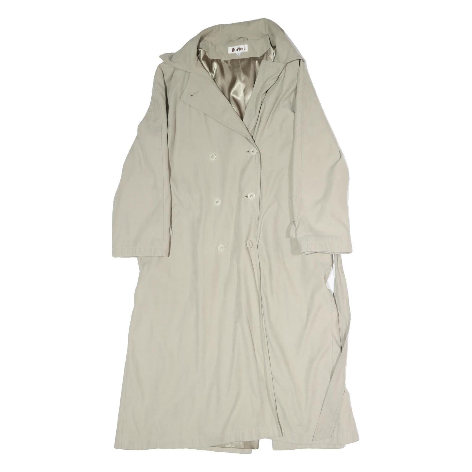 This BURTON womens jacket is crafted from a comfortable cotton blend in a light beige shade. It features a classic double-breasted trench style with button closure down the front and a matching fabric belt for waist definition. The jacket has a smooth inner lining that enhances its sleek appearance.