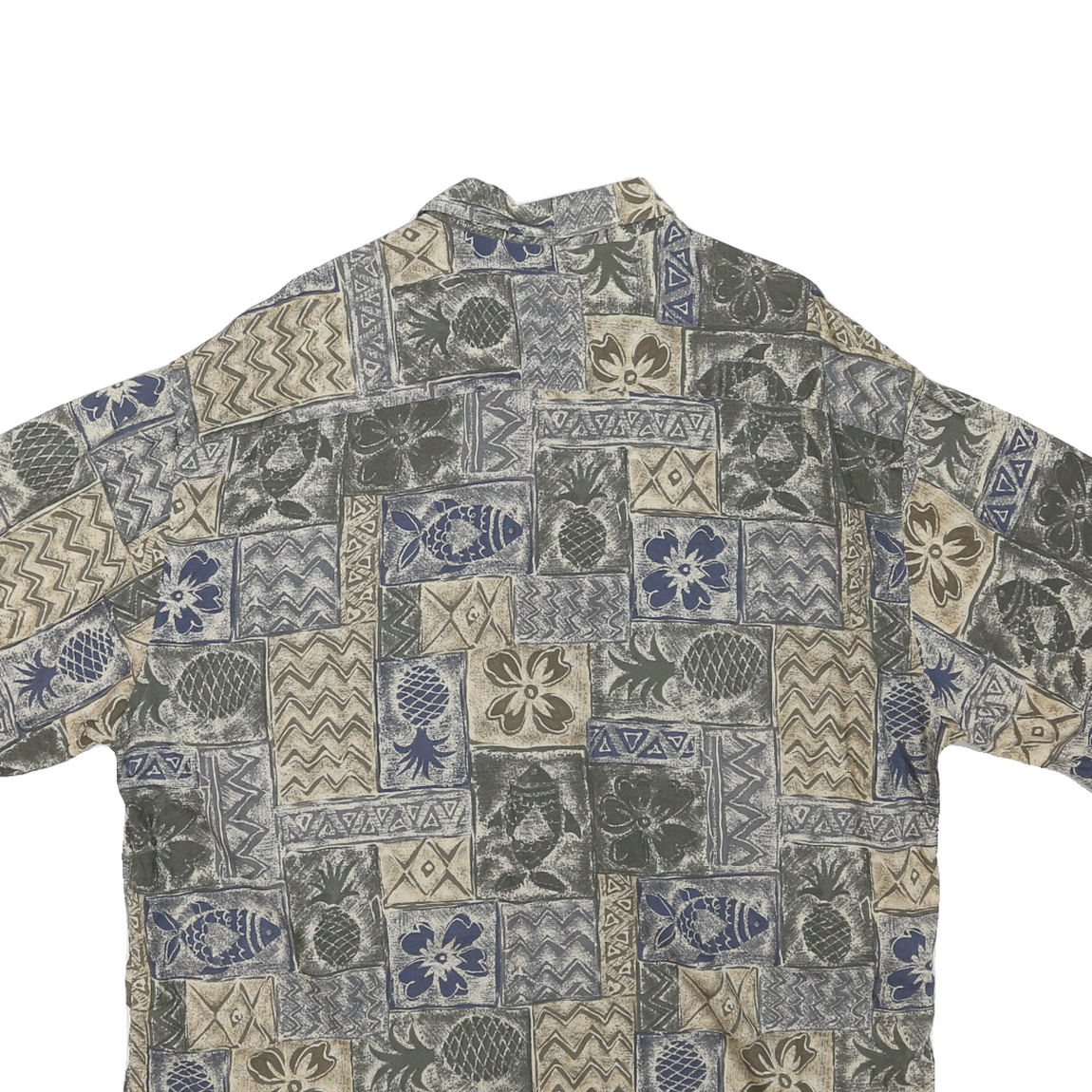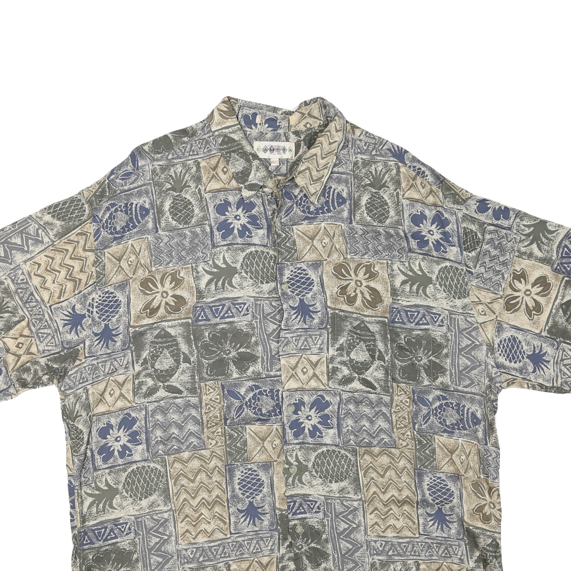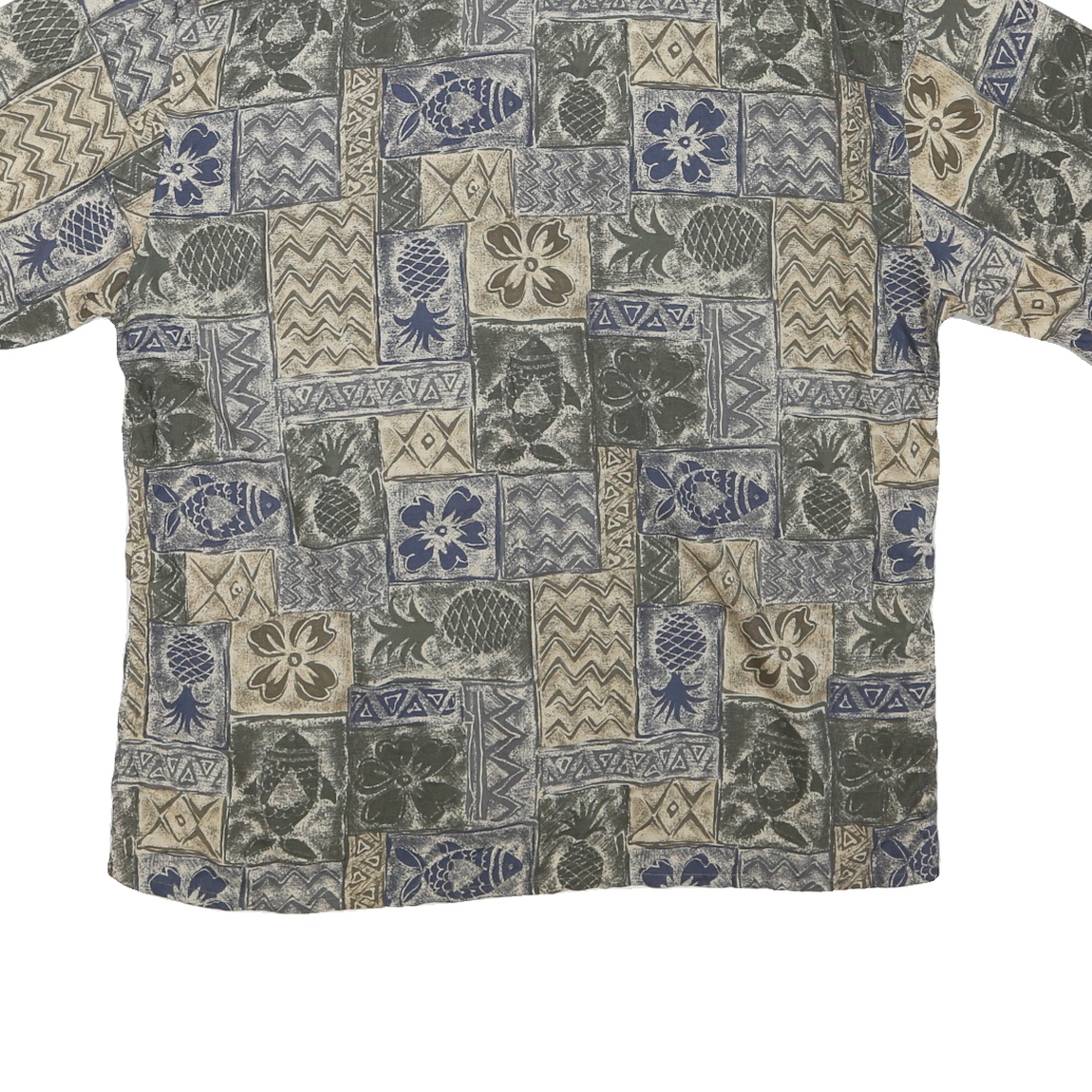 This Mens CAMPIA shirt features a distinctive patchwork style pattern composed of blue, beige, and greenish hues. The design includes various textured blocks incorporating tropical motifs such as pineapples, fish, and flowers, creating a relaxed, vintage-inspired look. The shirt has a classic point collar and short sleeves, perfect for warm weather or casual outings.
