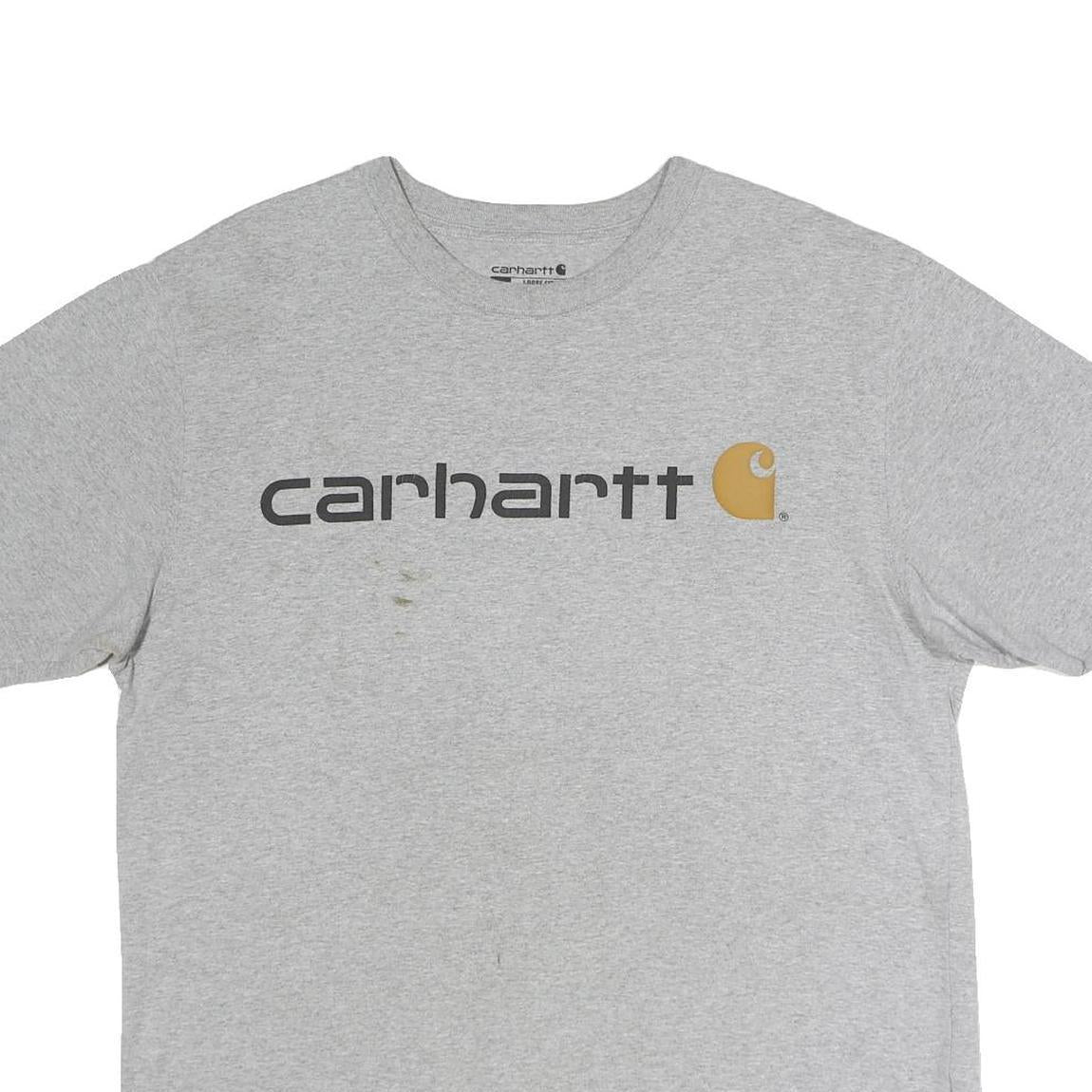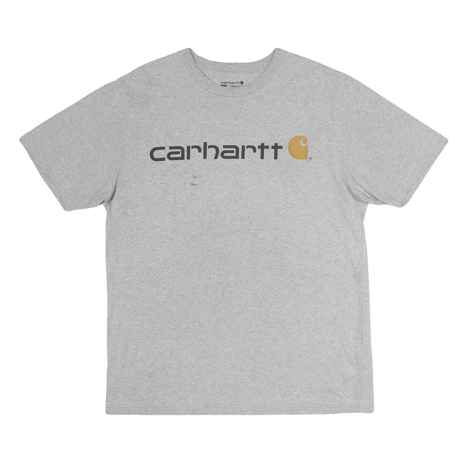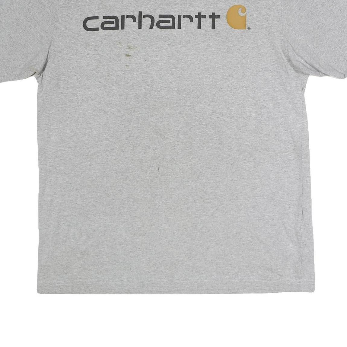 The fit is regular and relaxed, making it easy to wear on its own or layered under jackets and sweatshirts. This pre-loved shirt has visible signs of wear including minor stains on the front, reflecting a fair condition. Carhartt is well-known for durable workwear and this t-shirt carries their signature style with functional appeal.