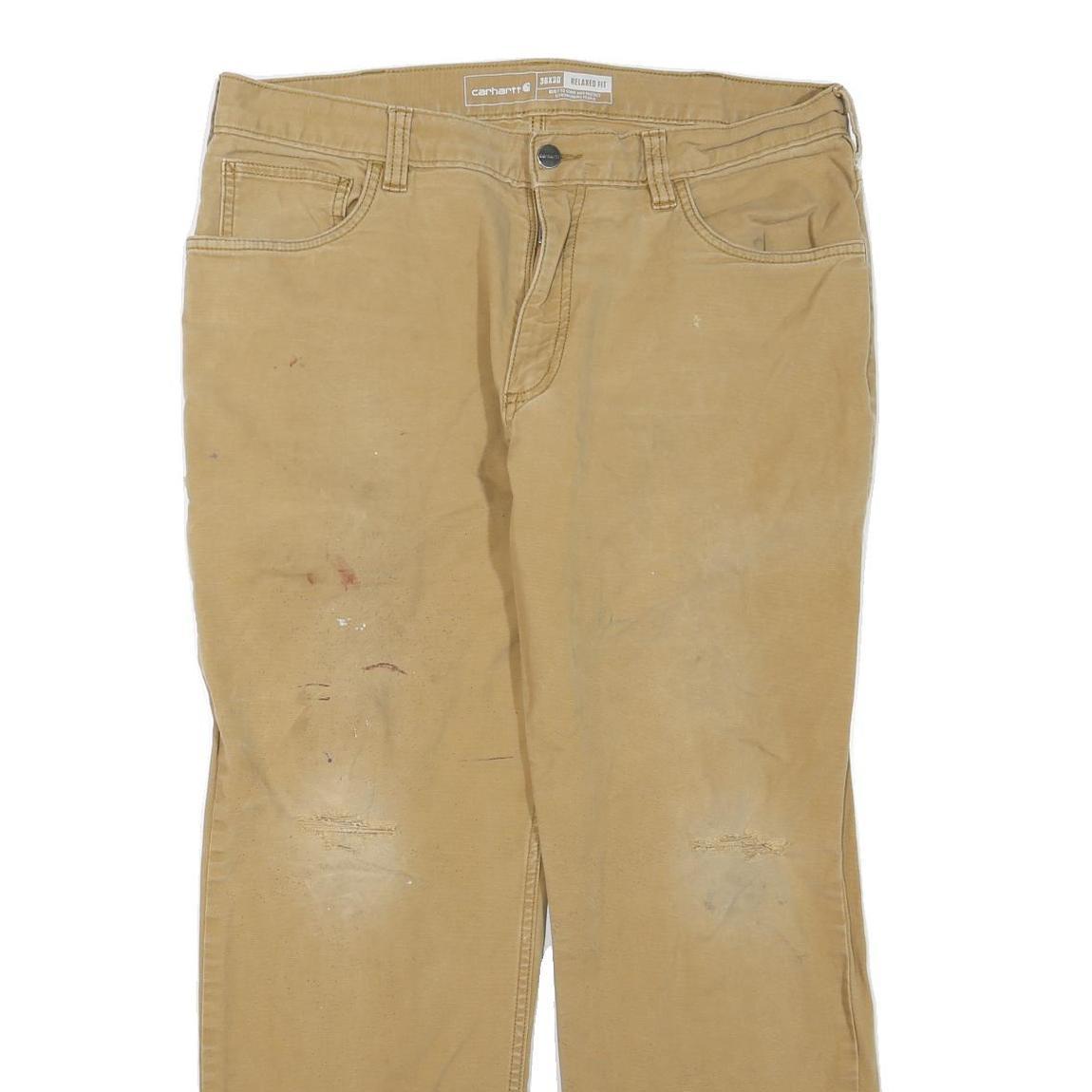 These jeans display signs of wear including paint marks and minor distressing on the legs, indicative of previous use but still retaining good structure. Ideal for casual or workwear styling, they offer a rugged, utilitarian look synonymous with the Carhartt name.