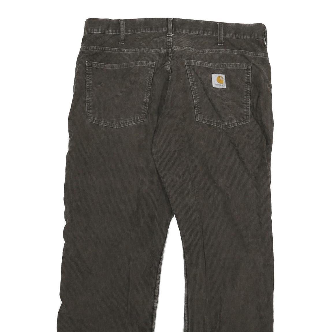 These Carhartt trousers feature a relaxed fit crafted from a durable cotton blend fabric with a soft corduroy texture in a rich brown colour. The front has a classic zip closure with button and five-pocket styling, while the back reveals two patch pockets with a branded patch on the right pocket.