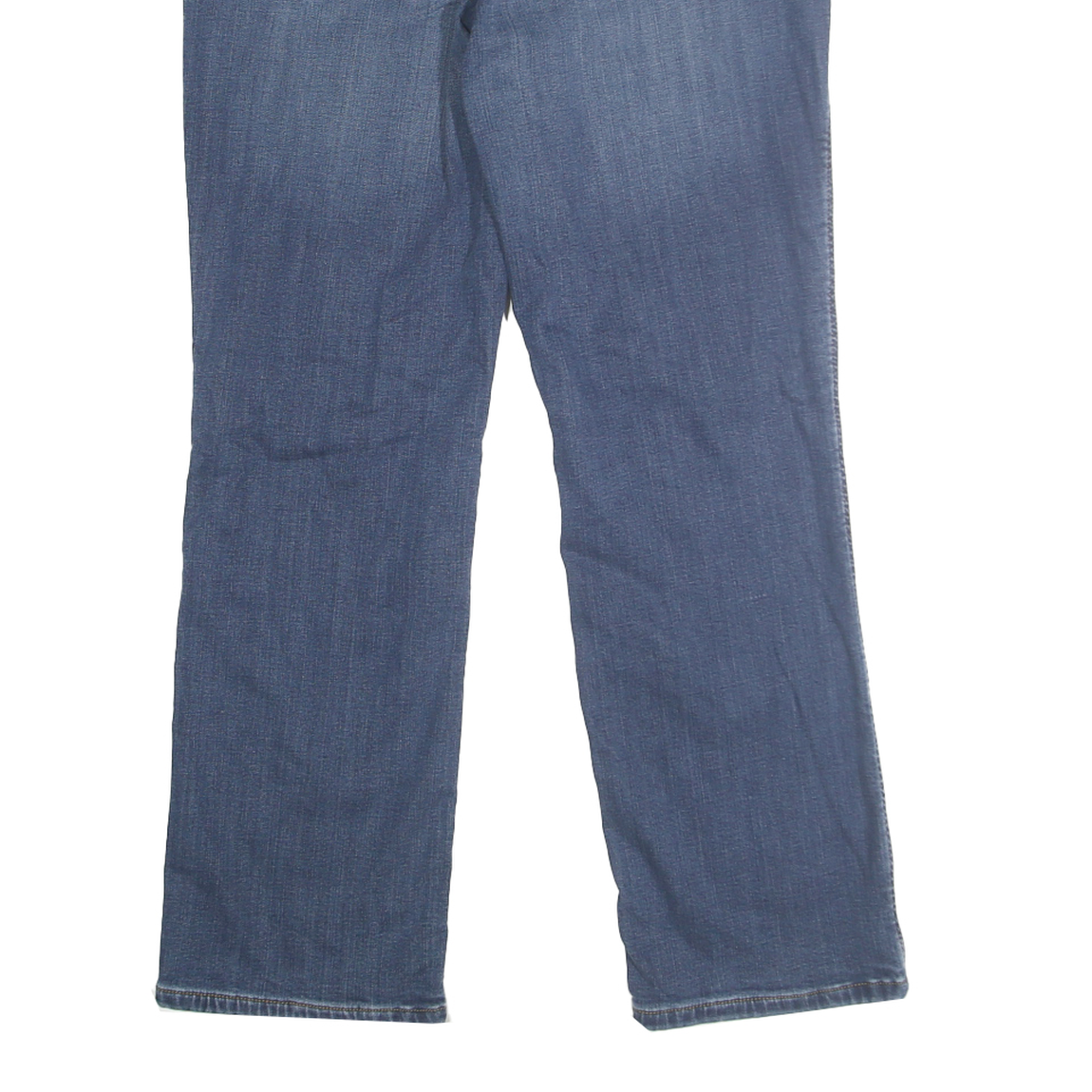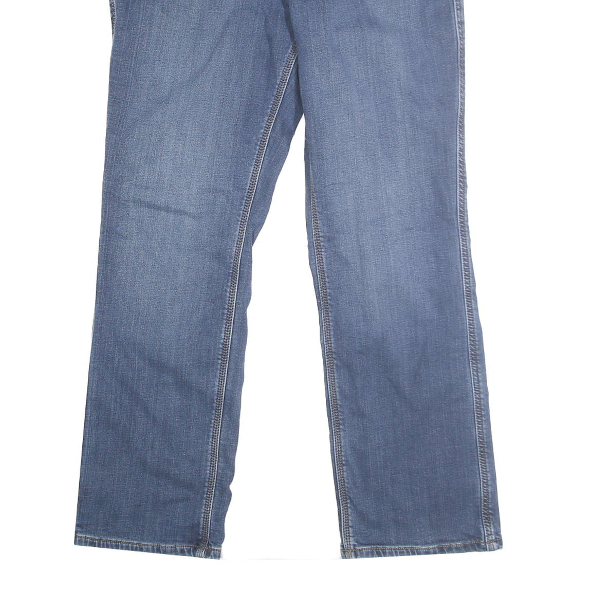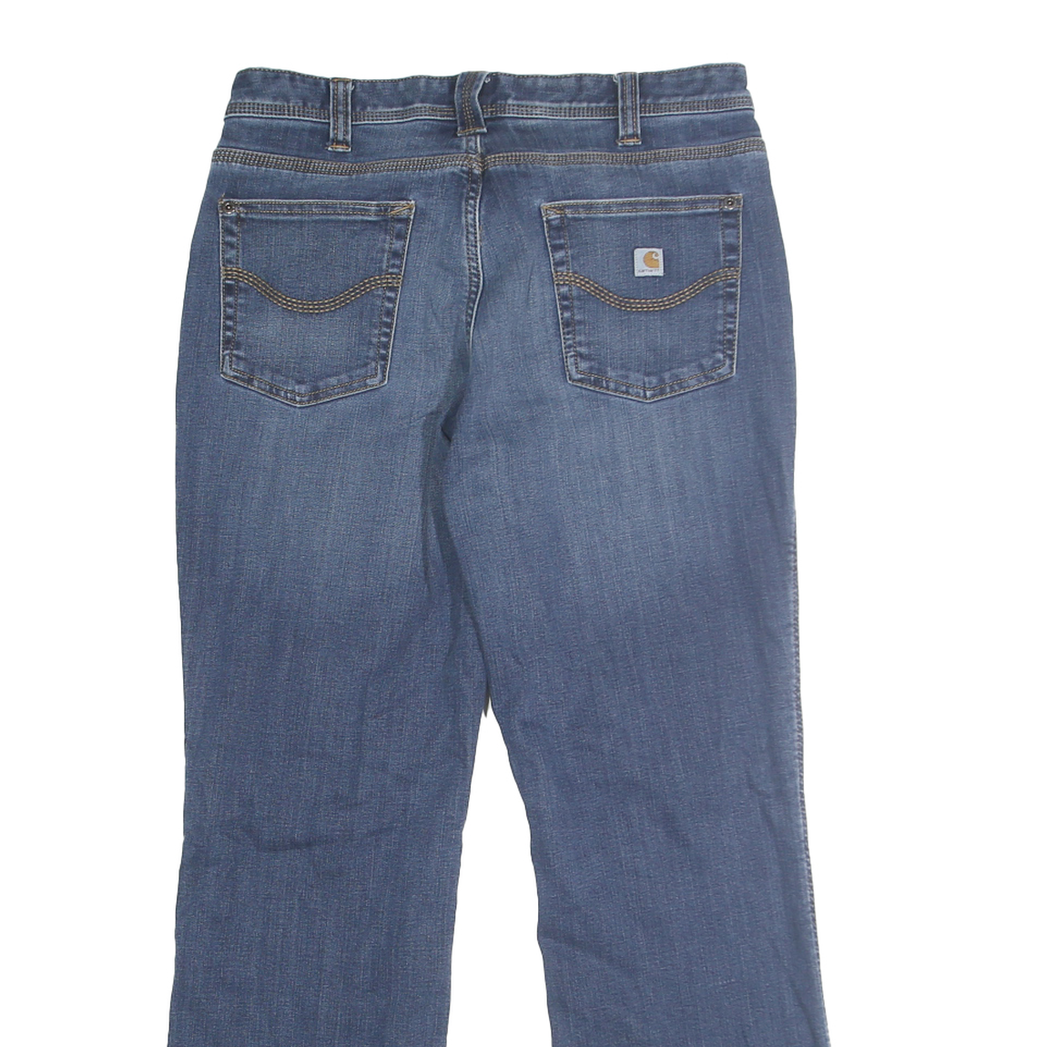 These Carhartt womens jeans present a classic straight leg design in a medium blue denim fabric. The front features a zip closure with a button and traditional five-pocket styling, including two back patch pockets with signature Carhartt logo detailing on the right-hand side. The denim has a softly worn appearance with subtle fading for a relaxed, casual look.