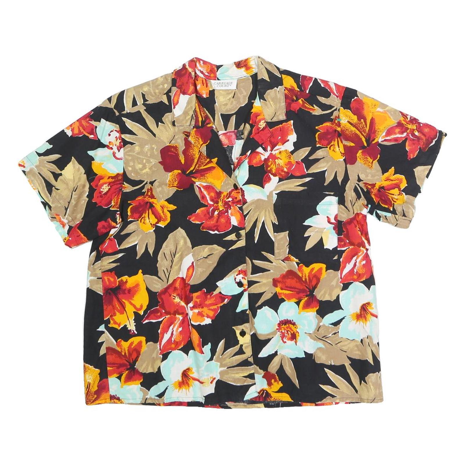This womens shirt by Carriage Court features a vibrant floral pattern in red, beige, yellow, and pale blue on a black background. The button-front blouse has a classic collar and short sleeves, presenting a relaxed and comfortable fit ideal for warm weather.