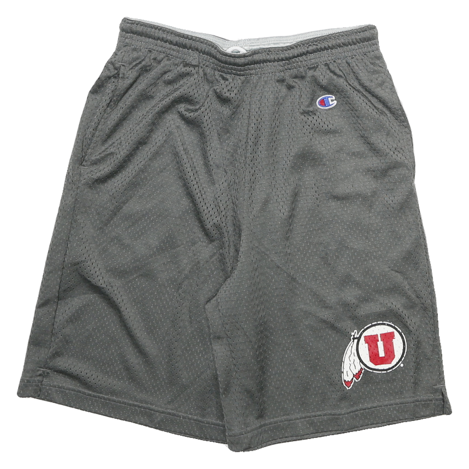 These mens CHAMPION shorts come in a solid grey colour with a subtle mesh texture throughout the fabric. They feature a red and white University logo on the front lower leg, along with the small embroidered Champion "C" logo near the waist. The shorts have a classic sporty style with an elasticated waistband for comfort and a relaxed fit.
