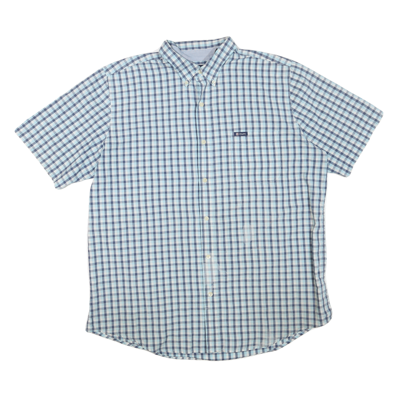 This Mens CHAPS shirt features a classic blue and white checked pattern throughout, with a small branded patch on the chest pocket adding subtle logo detail. The button-down collar and short sleeves create a clean, casual look ideal for warm weather.