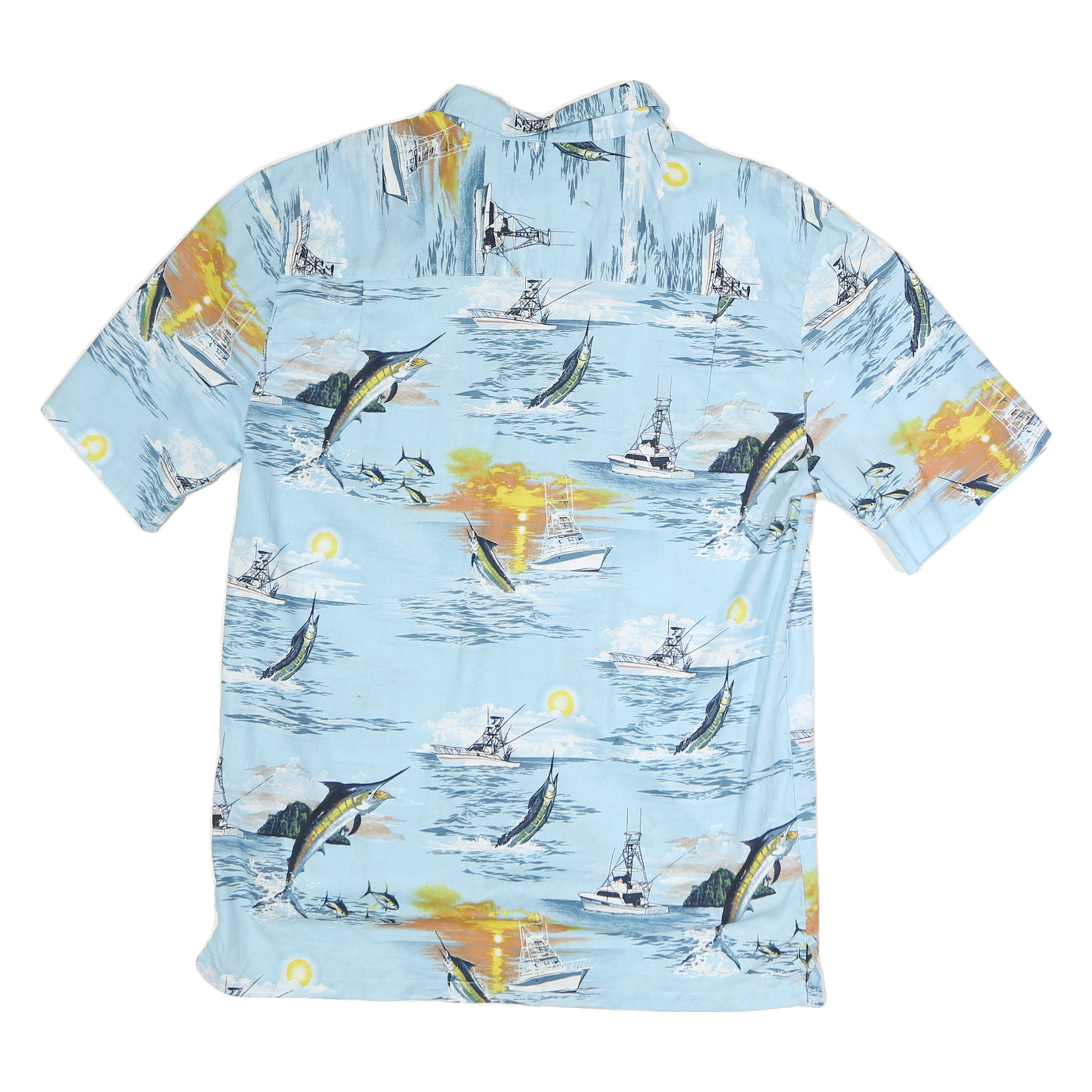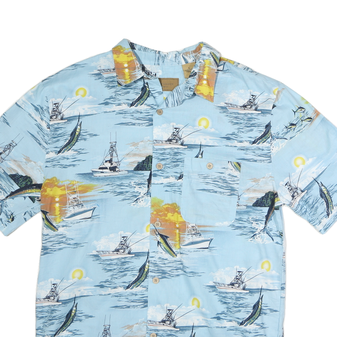 This CLEAR WATER men's shirt features a vibrant fishing-themed print against a soft sky blue background. The design includes boats, marlin fish, and ocean waves, complemented by hints of yellow and orange sunsets, creating a relaxed summer vibe. It has a classic short sleeve silhouette with a button-front closure and a single chest pocket.