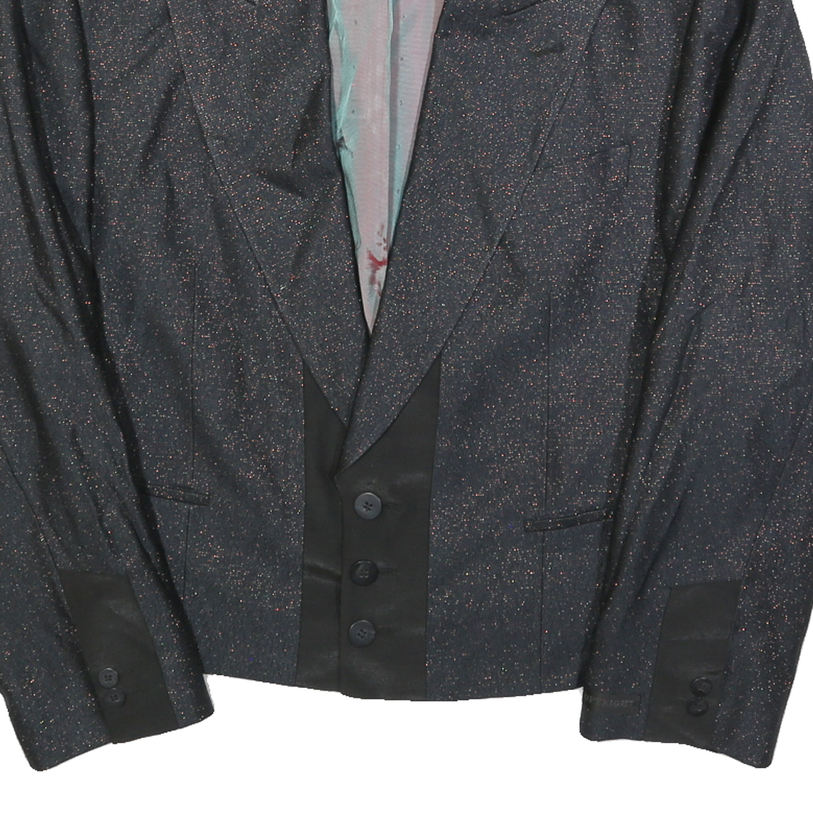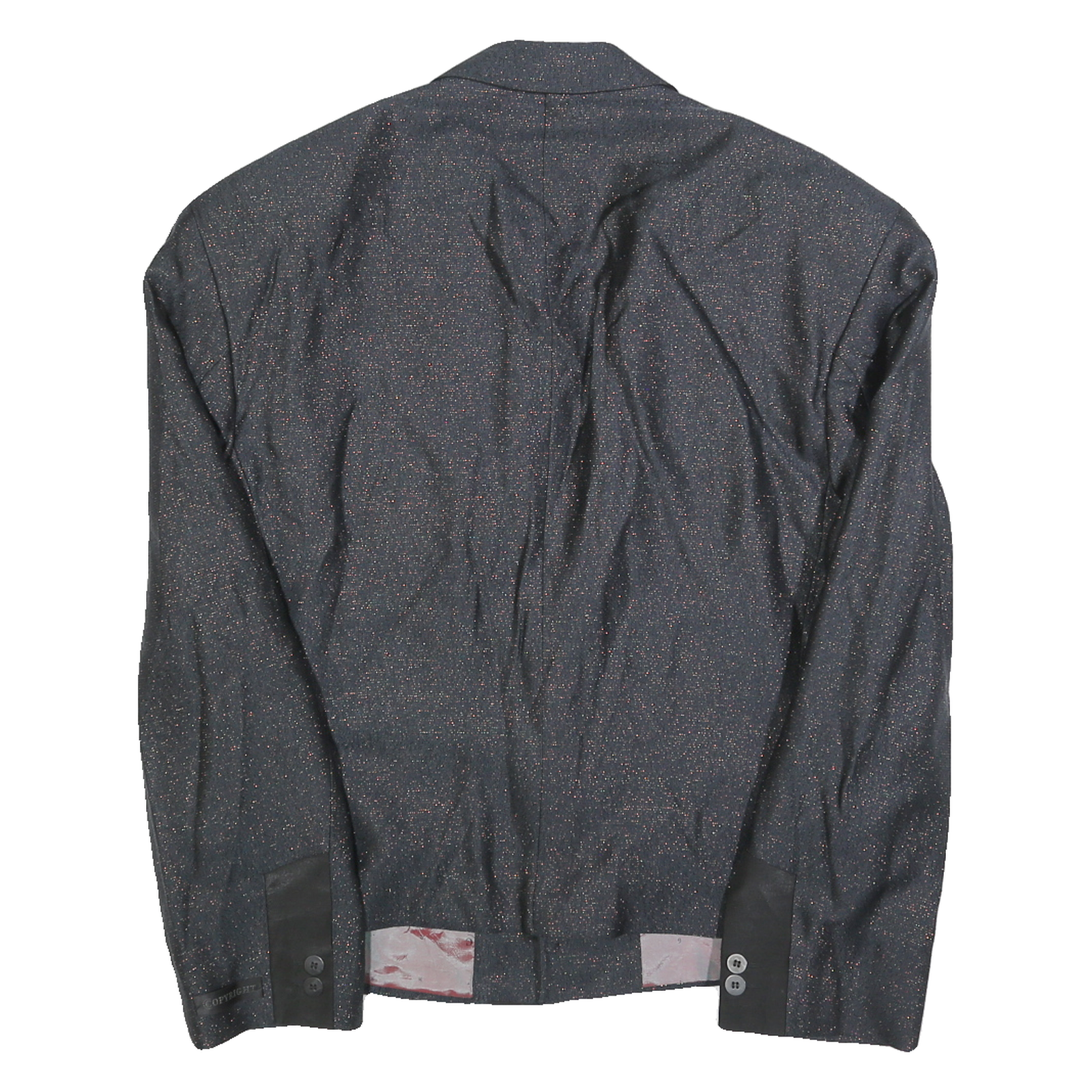 This mens COPY RIGHT jacket comes in a sleek black colour with a subtle shimmer throughout its fabric, creating a sophisticated and polished appearance. It features a classic button closure with three buttons on the front, and black contrast cuffs to enhance its refined style. The interior lining is a smooth fabric with the brand name visible.