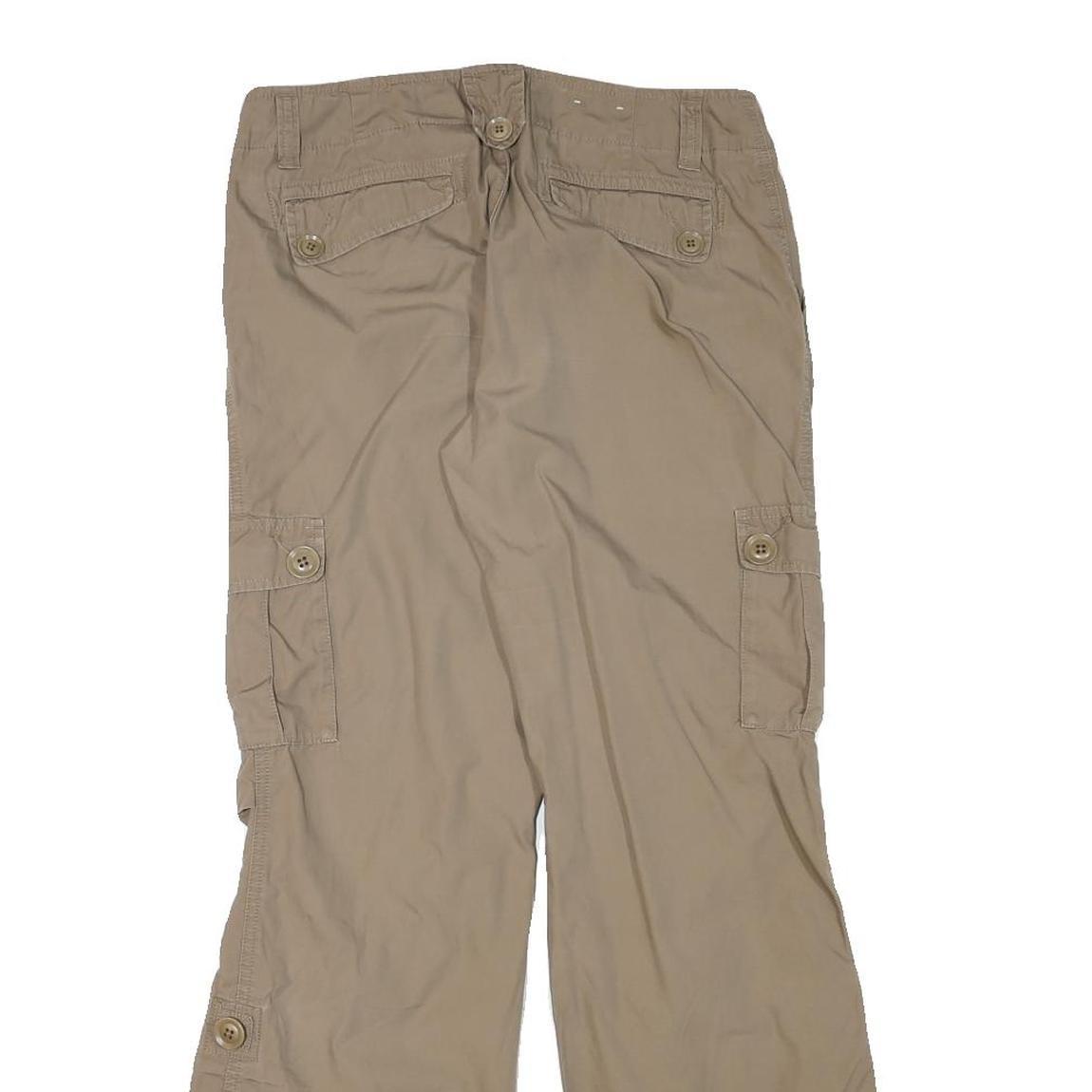These Eddie Bauer womens trousers feature a relaxed, comfortable fit with a wide-leg style in a durable cotton blend fabric. The beige colour offers a versatile and neutral look, perfect for casual wear or outdoor activities. The trousers include zip closure and multiple functional pockets, including side buttoned cargo pockets, enhancing their utility and style.