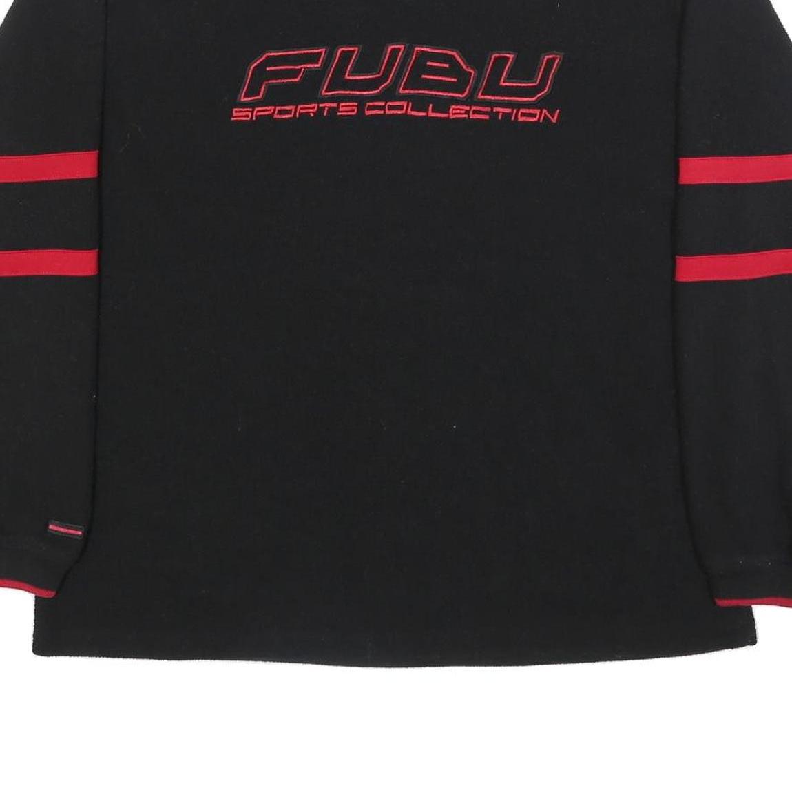 This womens jumper from FUBU features a black base with striking red accents, including twin stripes on both sleeves and a red lined V-neck collar. The front showcases a bold "FUBU Sports Collection" embroidered logo in red, giving it a sporty and stylish look. The back is plain black with a small logo tab near the collar.