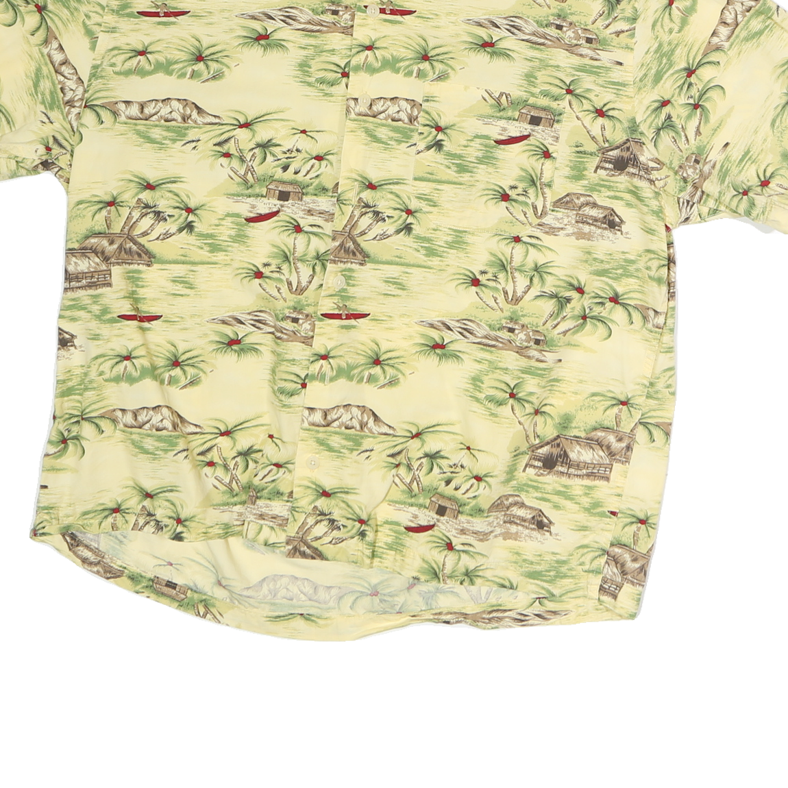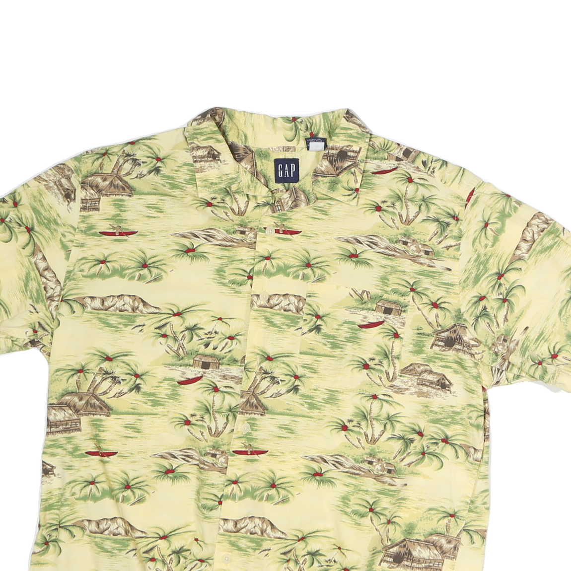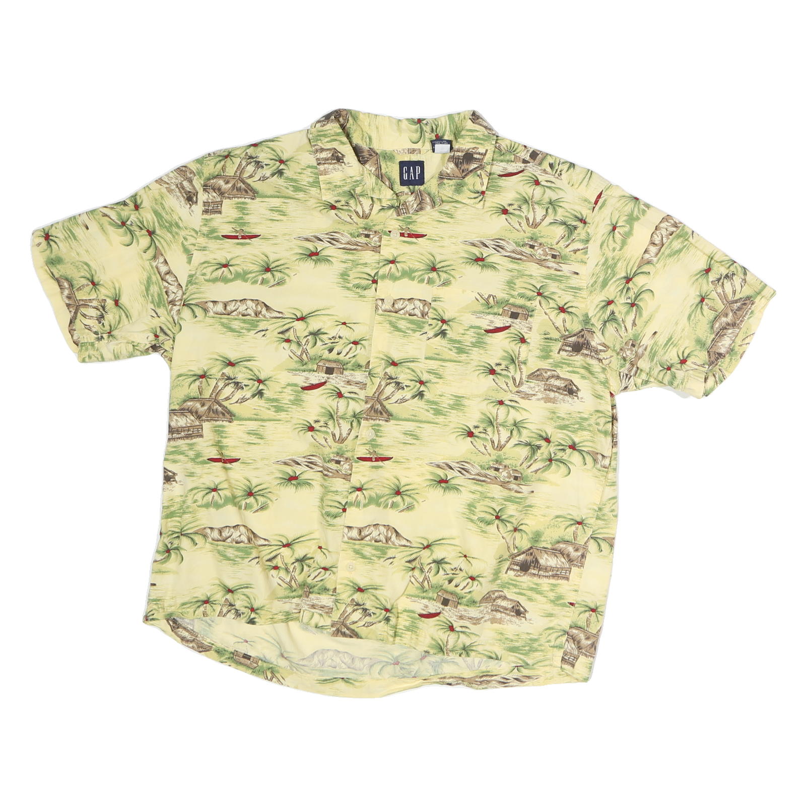 This GAP Mens shirt features a soft yellow base with an all-over Hawaiian-inspired print depicting palm trees, tropical huts, and red canoes across a serene landscape. The graphics are vintage-style with muted greens, browns, and a subtle red accent, providing a classic island vibe.