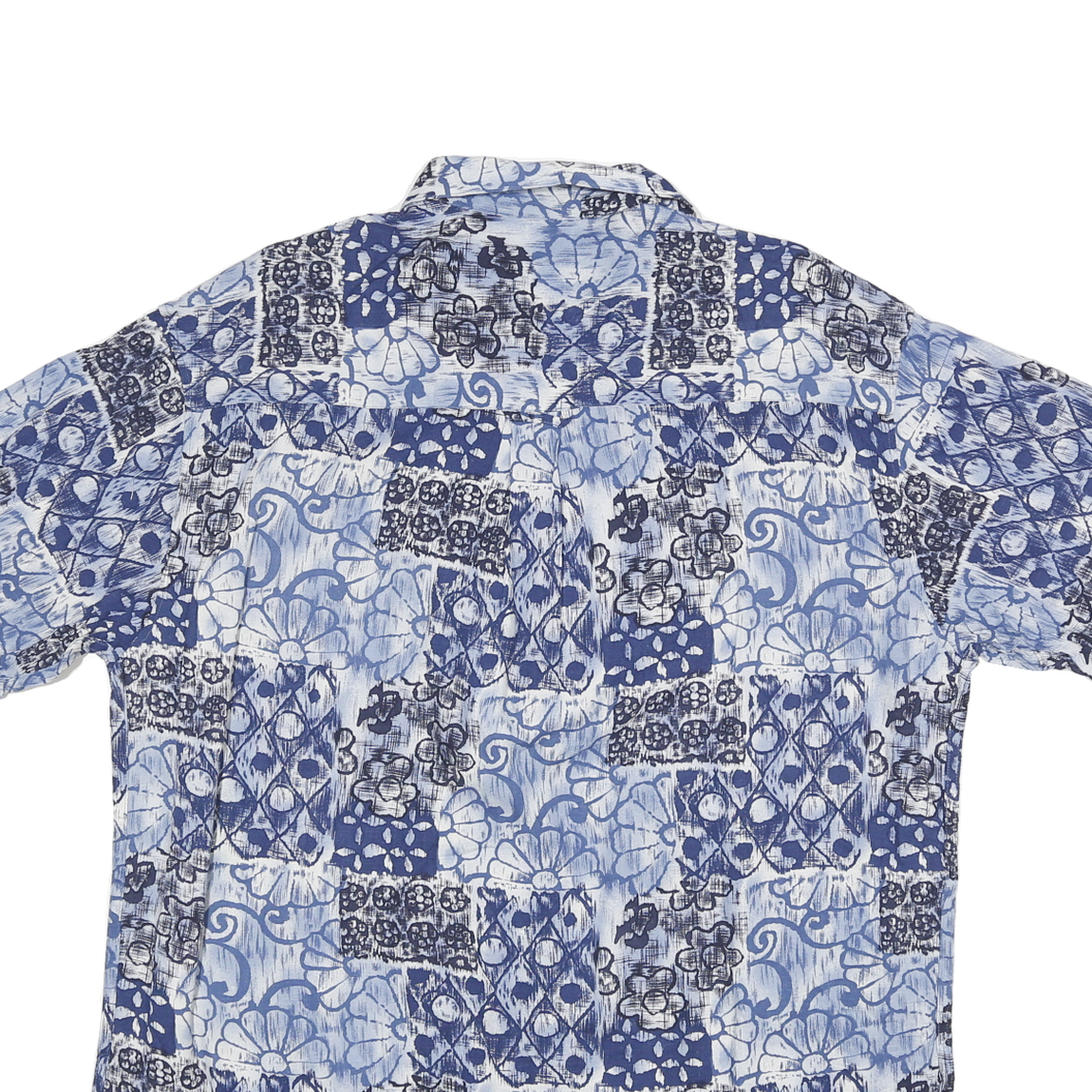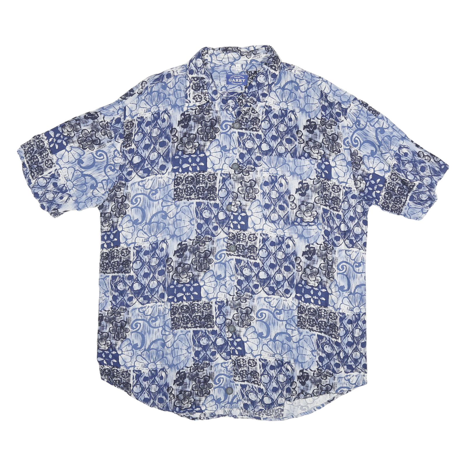 This GARRY Mens shirt features a vibrant patchwork pattern in shades of blue and white with florals and geometric shapes. The short sleeve design and classic button down collar add a relaxed, summery look. It has a single chest pocket that blends seamlessly into the print.