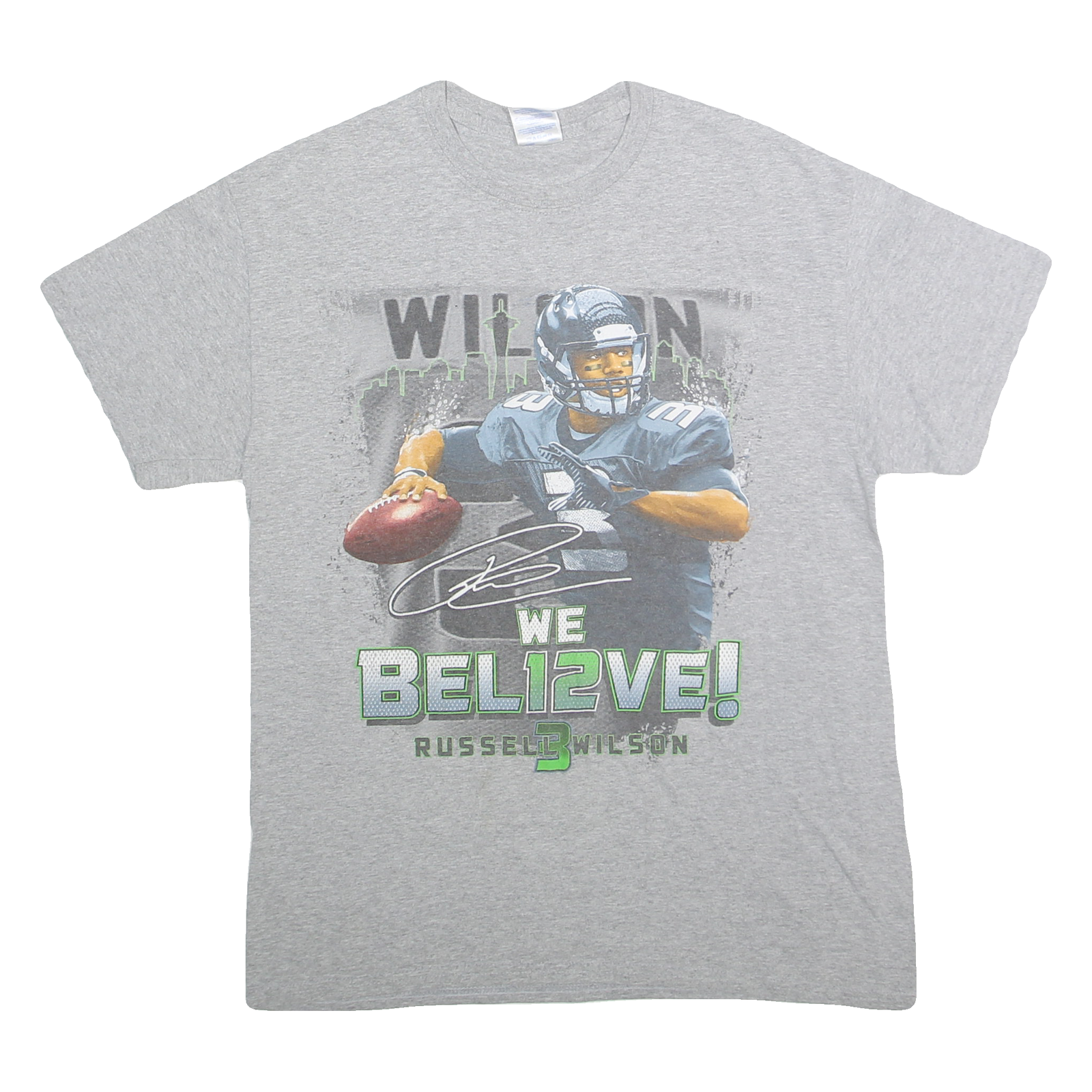 This GILDEN Mens T-Shirt features a grey base colour with a prominent graphic print on the front. The graphic displays an image of an American football player holding a football with text including "WE BEL12VE!" and the name "Russell Wilson." It also shows a city skyline silhouette in the background and the number 3 incorporated in the design. The print is bold and sports-themed without explicitly attaching to a specific football team.