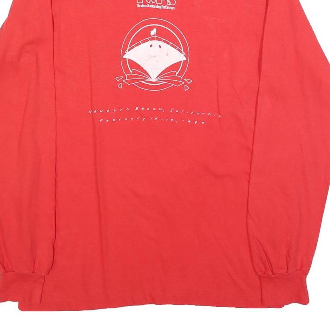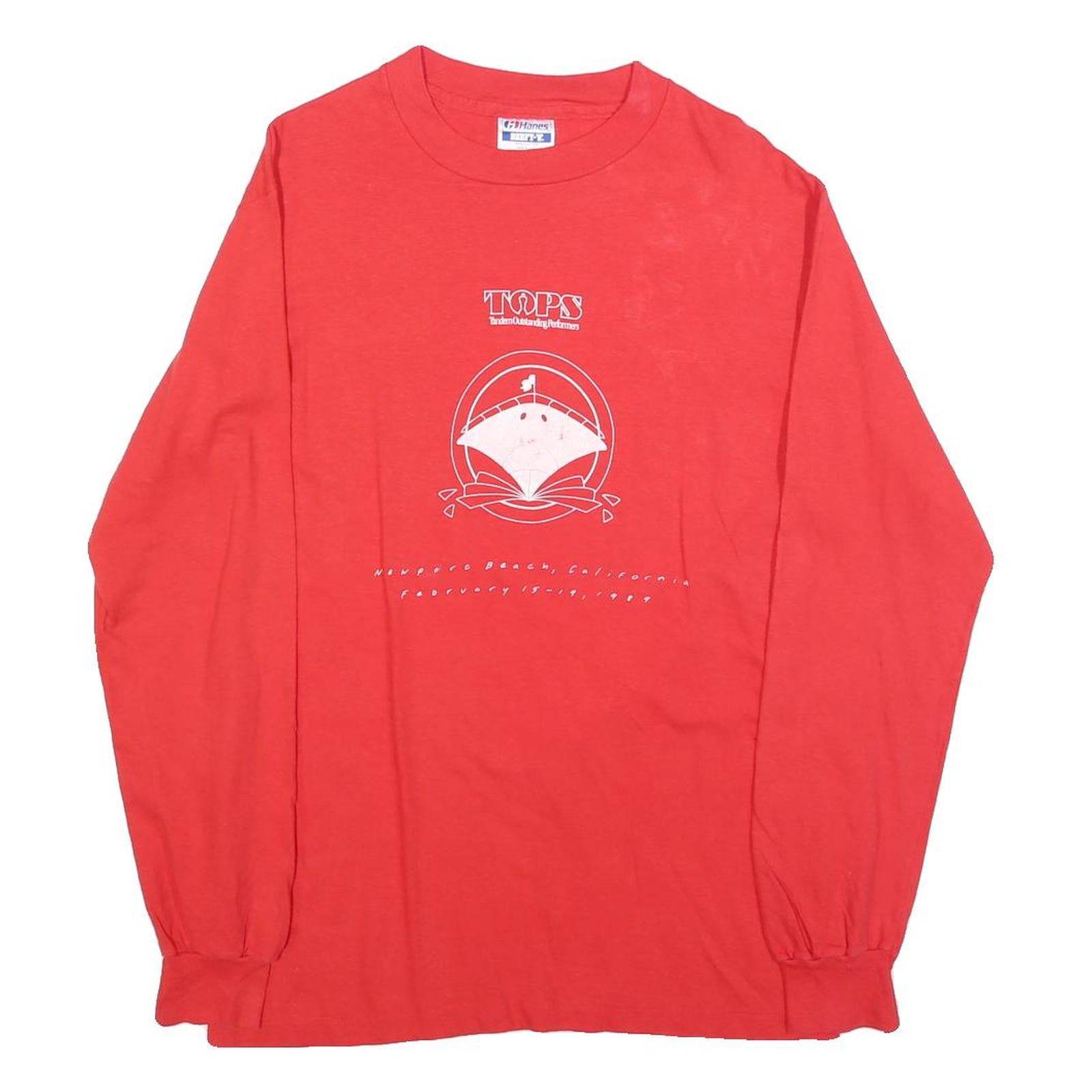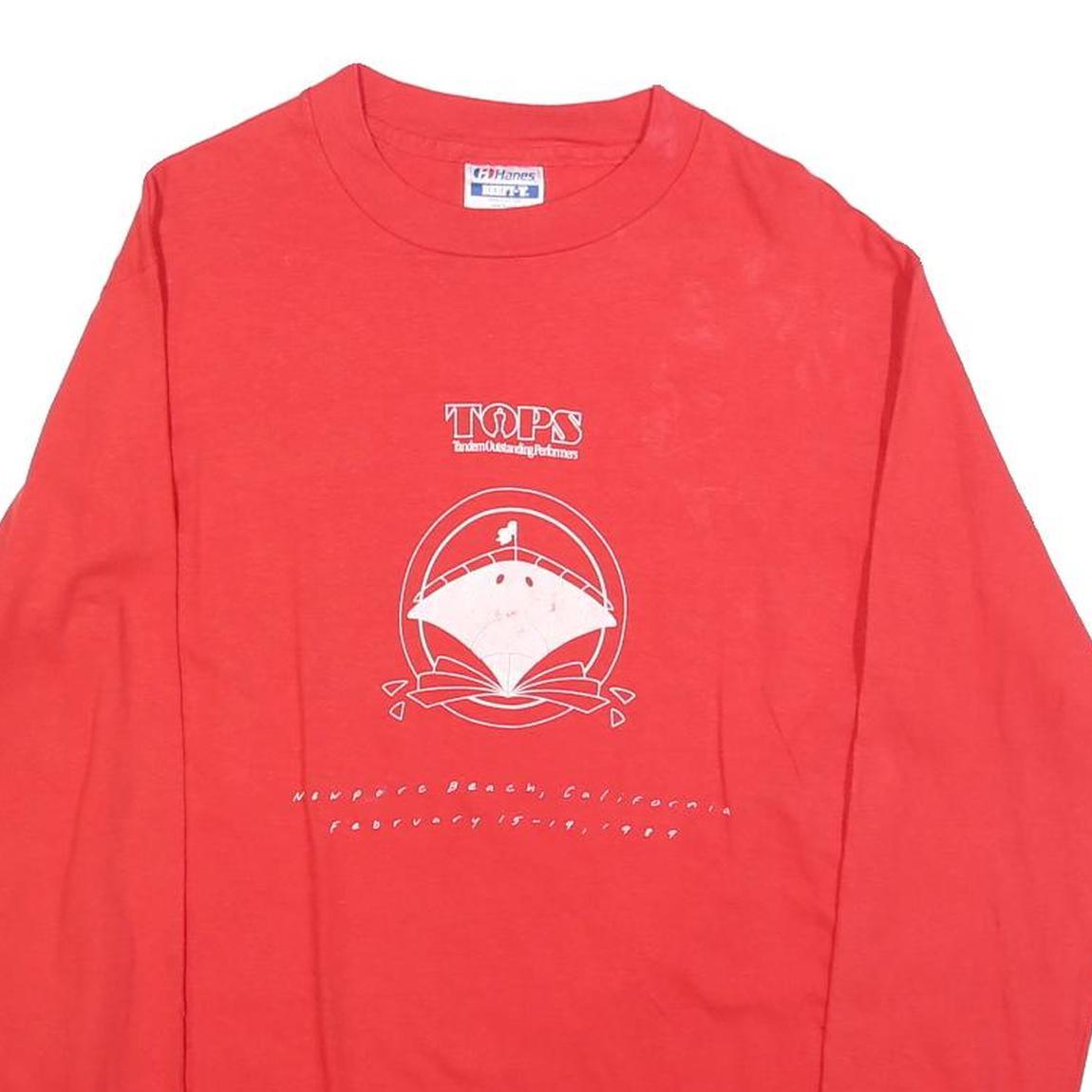 This Hanes mens T-shirt features a bright red colour with a central graphic print in white, showing the word "TOPS" and a design resembling a fan or structure with text beneath referencing Newport Beach, California and dates from 1989. The garment has long sleeves with elasticised cuffs and a classic crew neck style. The back of the shirt is plain without any graphics or text.