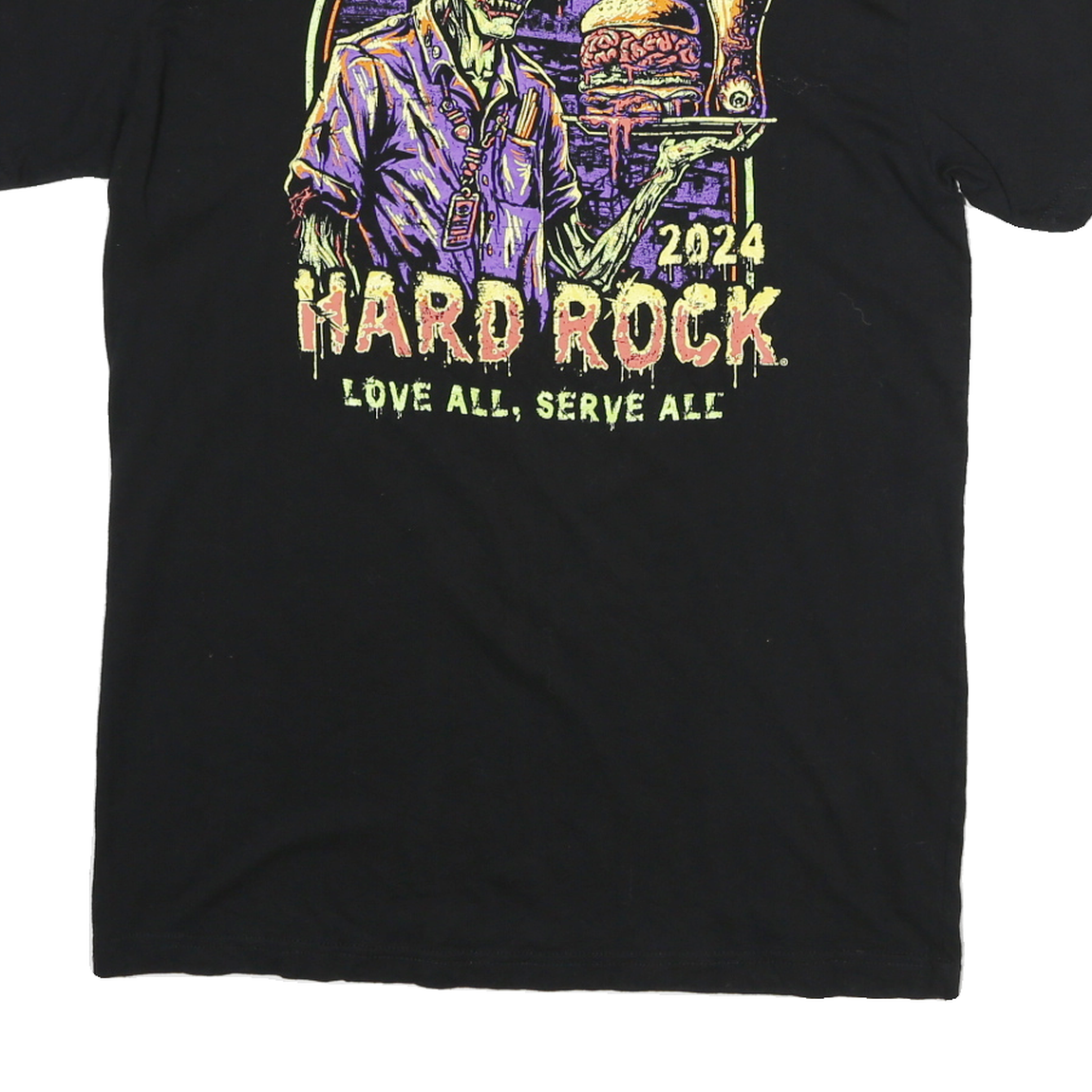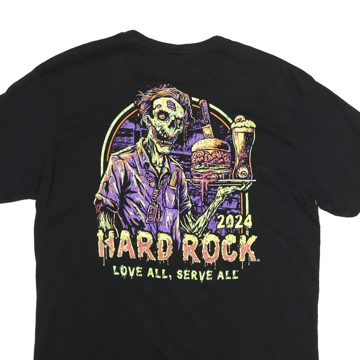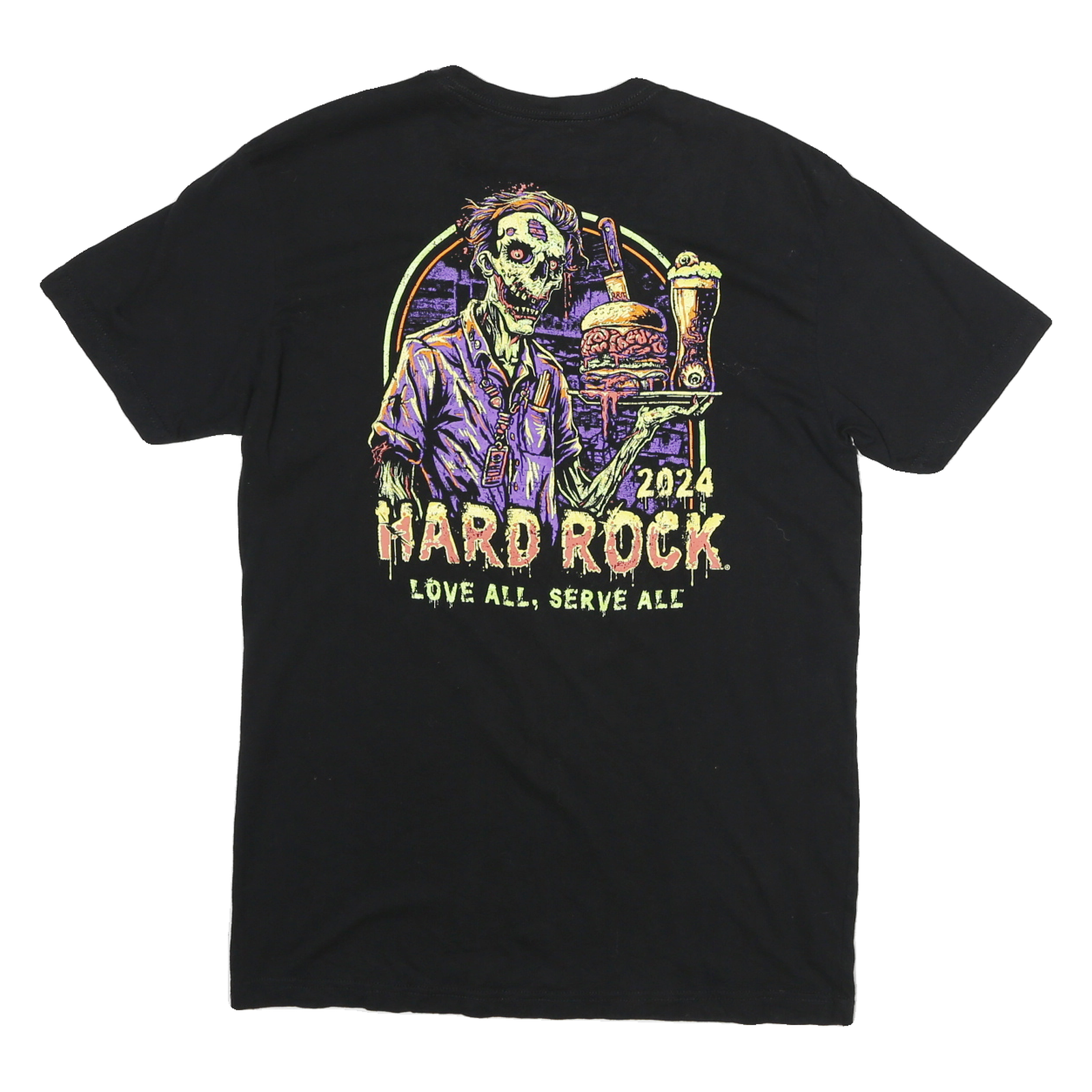 This Hard Rock Cafe mens T-shirt is crafted from a soft cotton blend fabric in a classic black colour. The front features a small lime green Hard Rock Cafe Orlando logo on the chest, adding a subtle branded touch. The back displays a vibrant graphic of a zombie waiter carrying a tray with a burger and beer, accompanied by the text "HARD ROCK 2024 LOVE ALL, SERVE ALL" in matching neon hues.