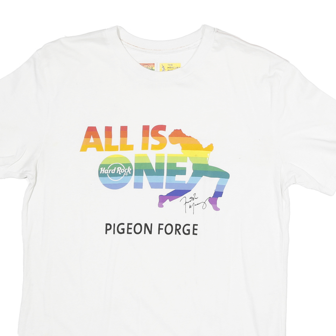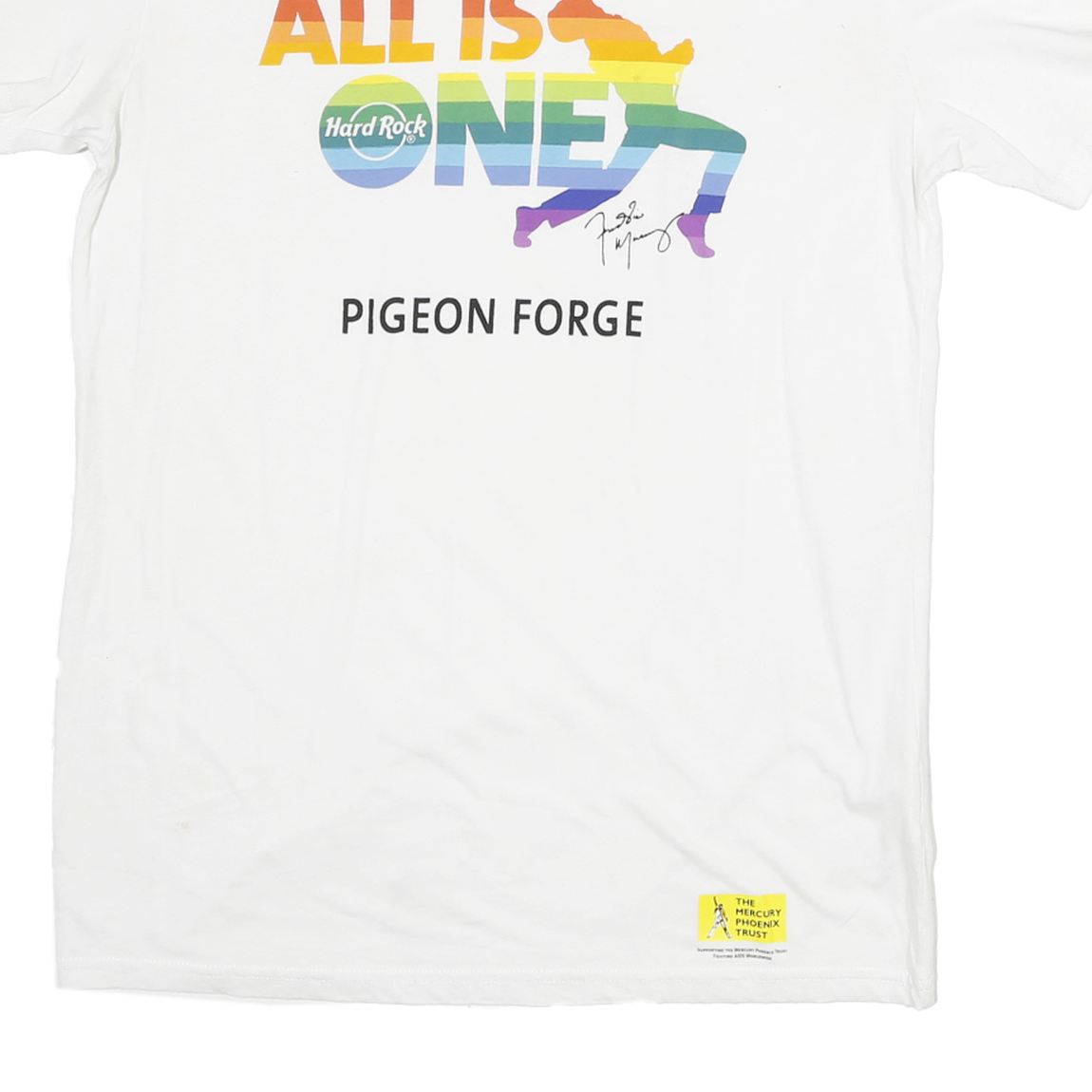 This Hard Rock Cafe mens T-shirt is crafted from a soft cotton blend fabric in a crisp white colour. The front features a colourful graphic print with the phrase "ALL IS ONE" in a rainbow gradient, including the Hard Rock logo integrated within the word ONE. Below this is the location name "PIGEON FORGE" in black text. The graphic also incorporates a stylised silhouette figure in rainbow stripes with a signature printed beneath.