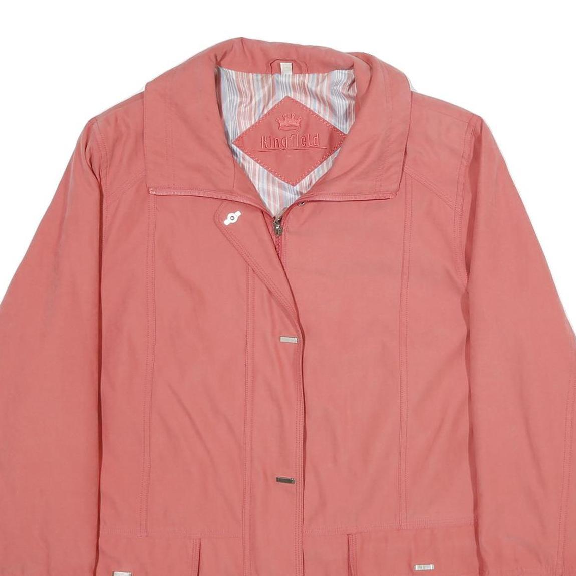This womens jacket from Kingfield is a soft coral colour, crafted from a polyester blend fabric. The jacket features a plain design with subtle vertical stitch detailing and a classic collar. Its front zipper closure is concealed by an additional panel with small metal accents, giving it a sleek and tidy appearance.