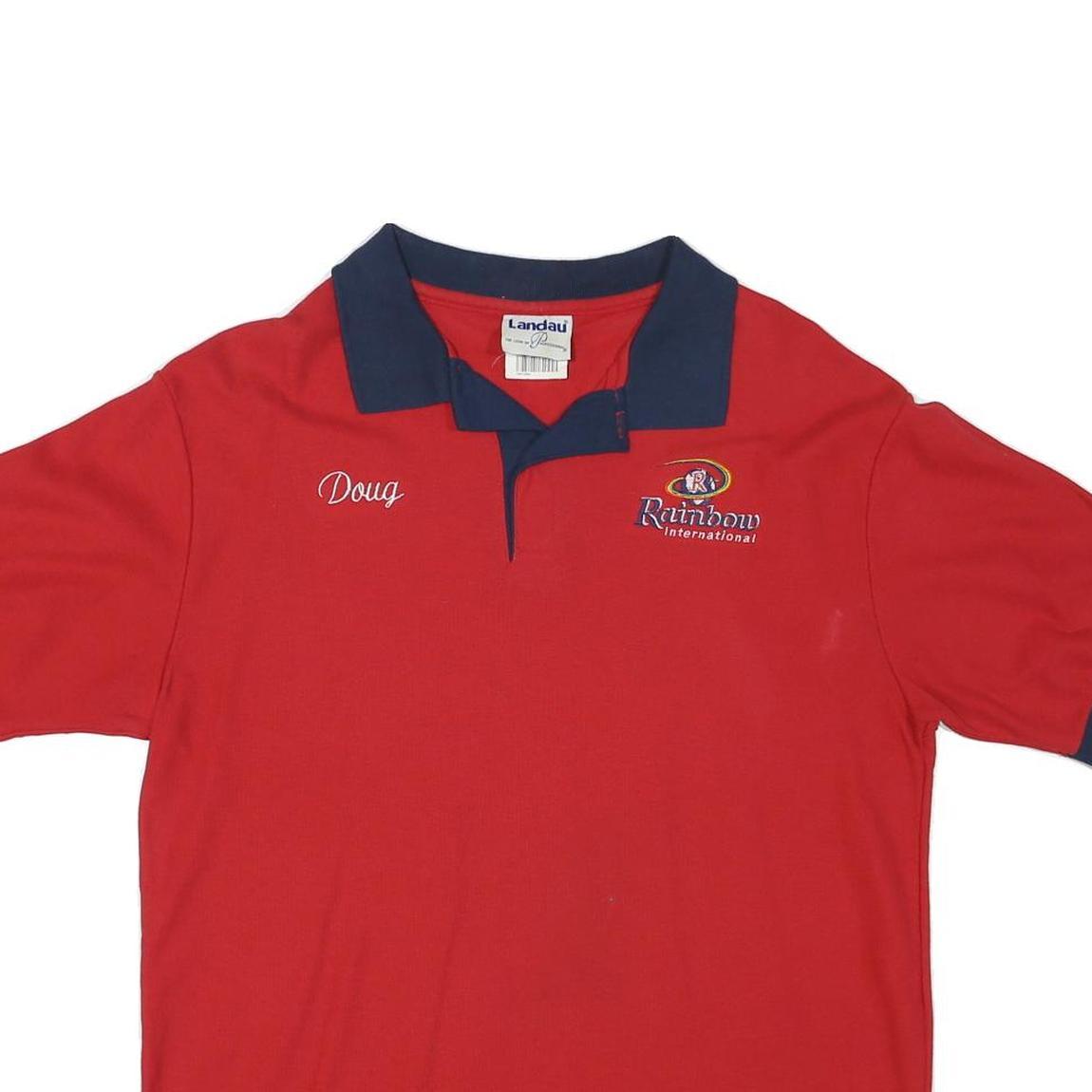 This Mens polo shirt by LANDAU features a striking red body with contrasting navy blue collar and sleeve cuffs. It has an embroidered "Rainbow International" logo on the left chest alongside a "Doug" name detail on the right side, offering a personalised touch. The collar is a classic point style with a concealed button closure.