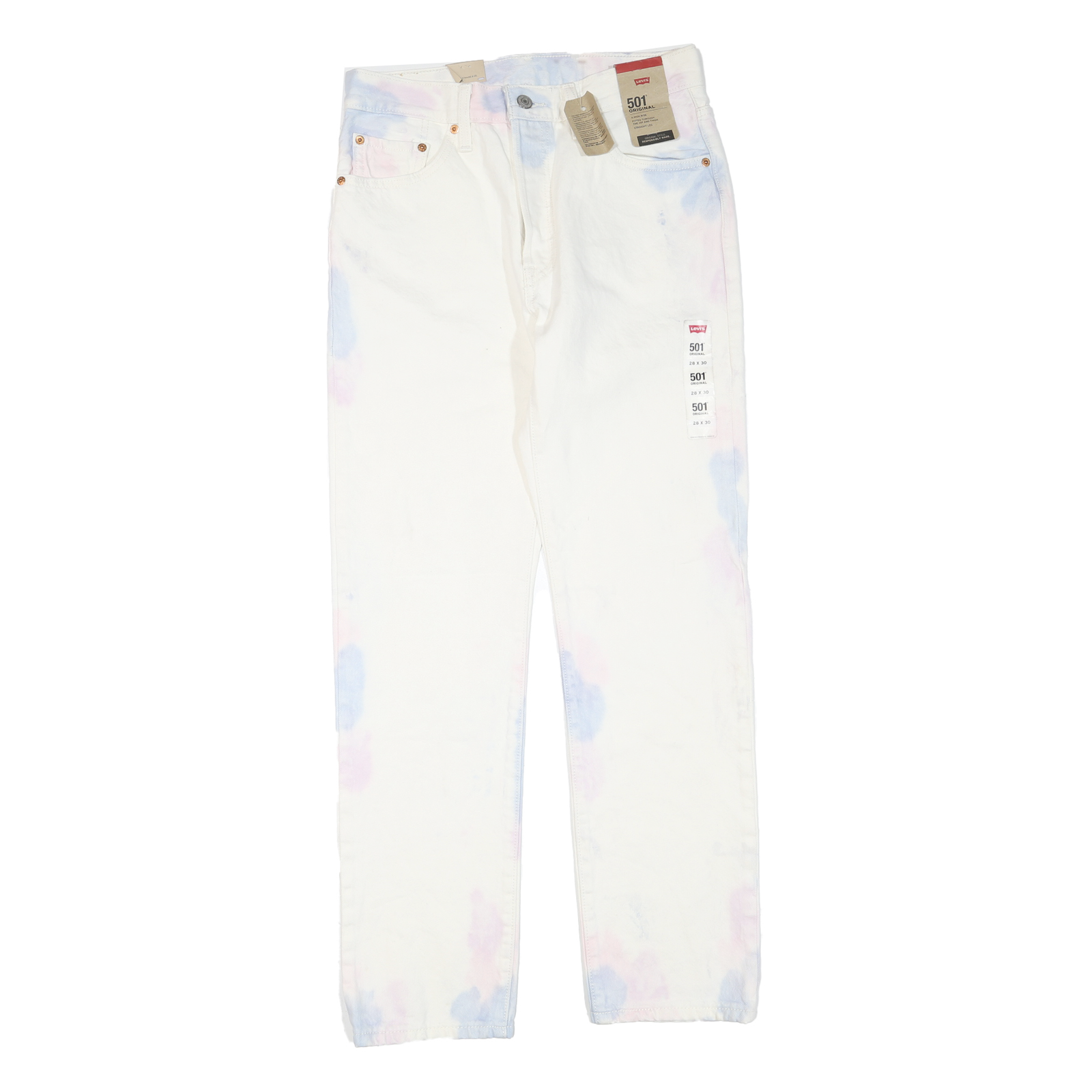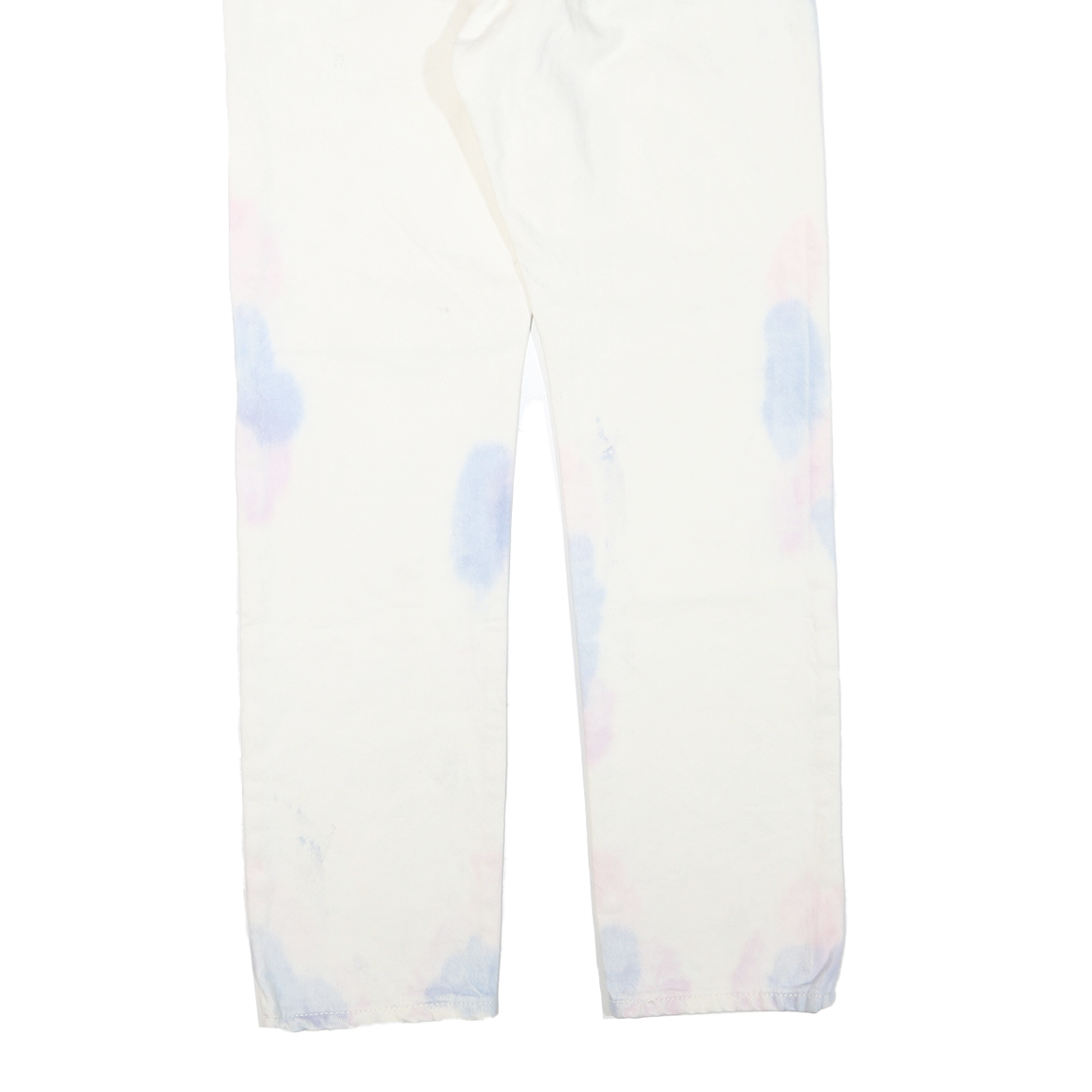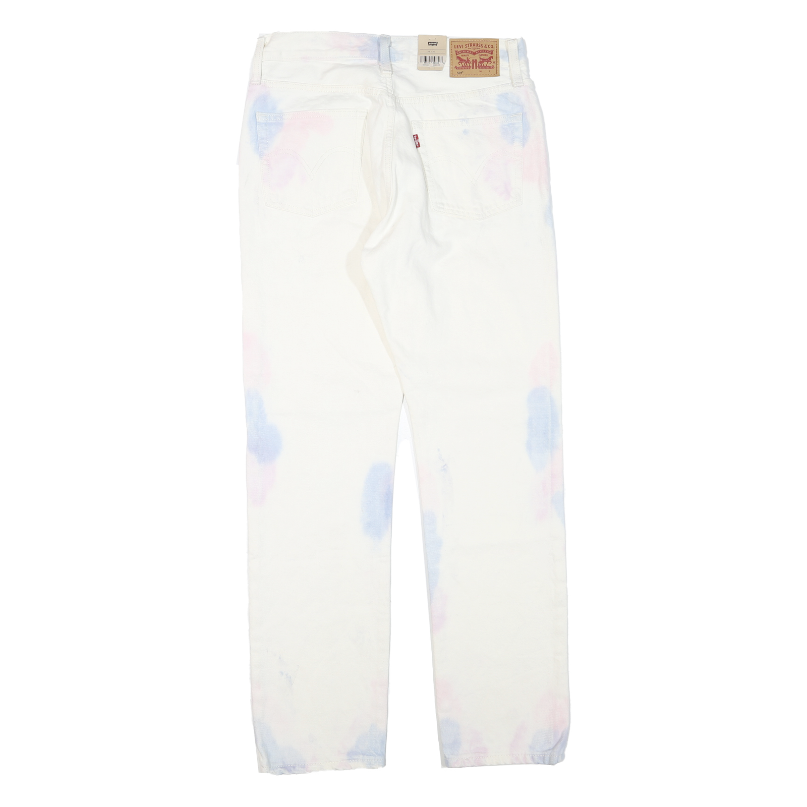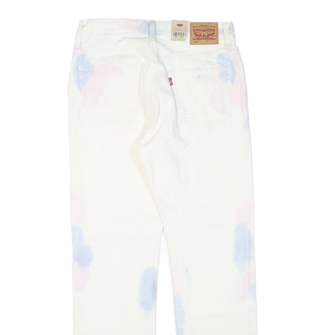 These womens LEVI'S 501 jeans feature a predominantly white fabric accented with subtle pale blue and pink tie-dye spots. The classic 501 styling includes signature copper rivets and a branded leather patch on the back waistband. The jeans have a button closure and come with the original tags attached, underscoring their authenticity.
