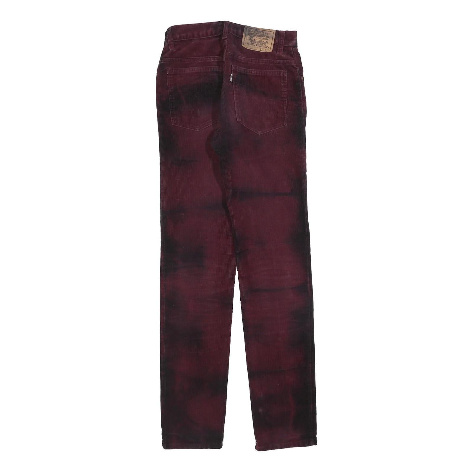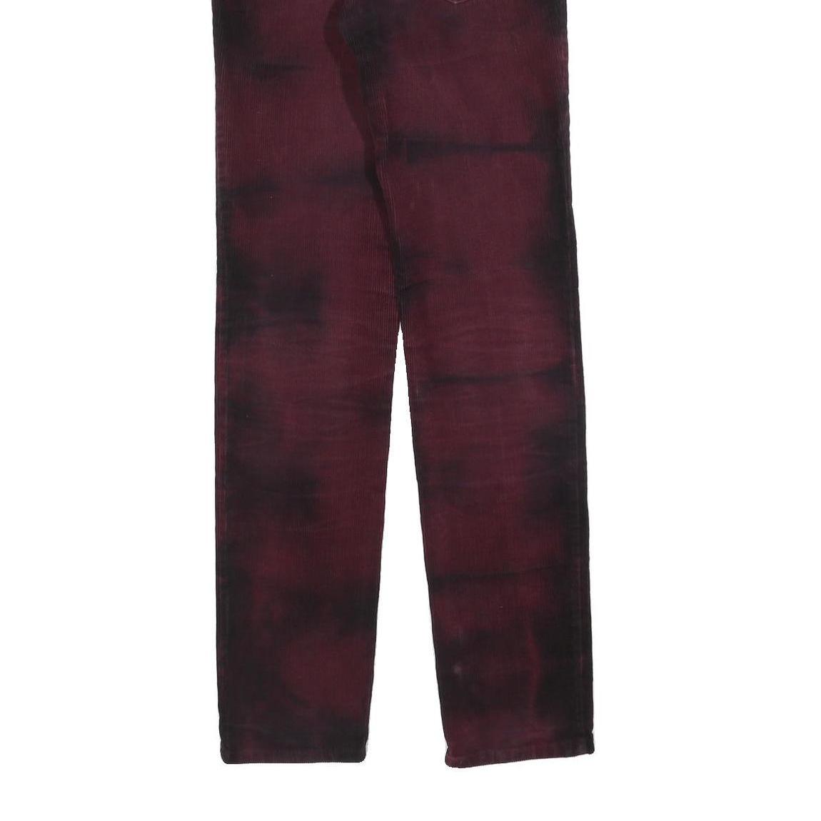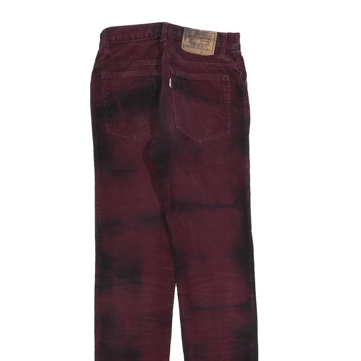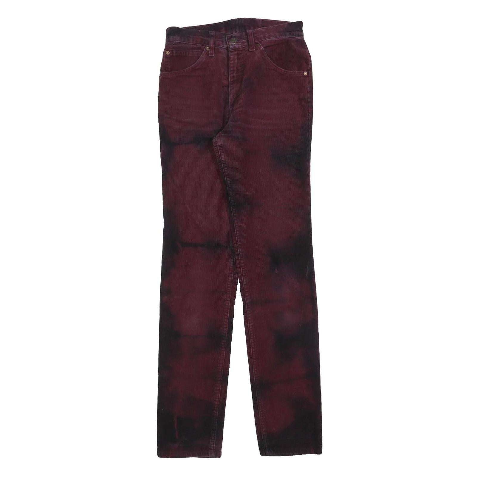 These LEVI'S womens trousers feature a rich burgundy colour with a subtle tie-dye effect in darker shades, adding an edgy and unique look. They have traditional classic five-pocket styling with copper rivet details and a zip closure at the front. The iconic leather patch branding is visible on the back waistband, emphasizing the authentic LEVI'S heritage.