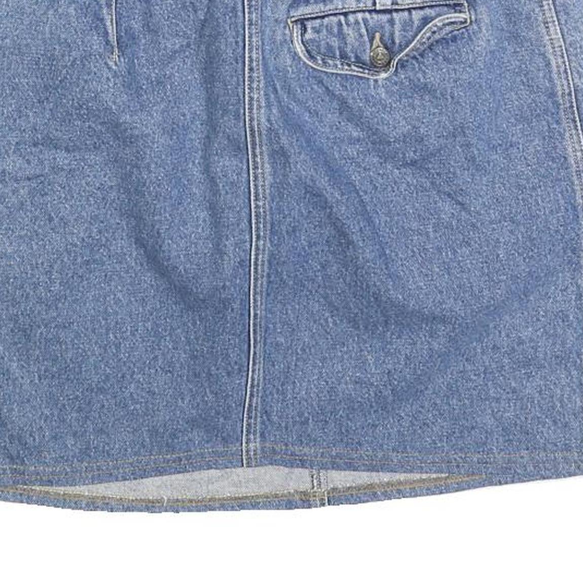 This LIZ WEAR womens skirt features a classic blue denim cotton fabric with a plain textured design. The mini length and straight cut provide a versatile and casual look suitable for everyday wear. It has a double button and zip closure at the front and belt loops for added styling options.