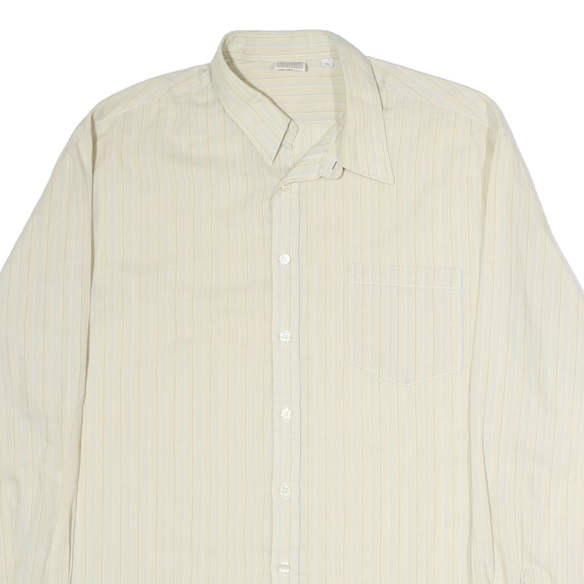 This LORD GEORGE Mens shirt features a cream base colour with fine blue vertical stripes, creating a subtle and classic striped pattern. It has a traditional pointed collar and a single breast pocket on the front left side. The shirt fastens with white buttons down the front and on the cuffs.