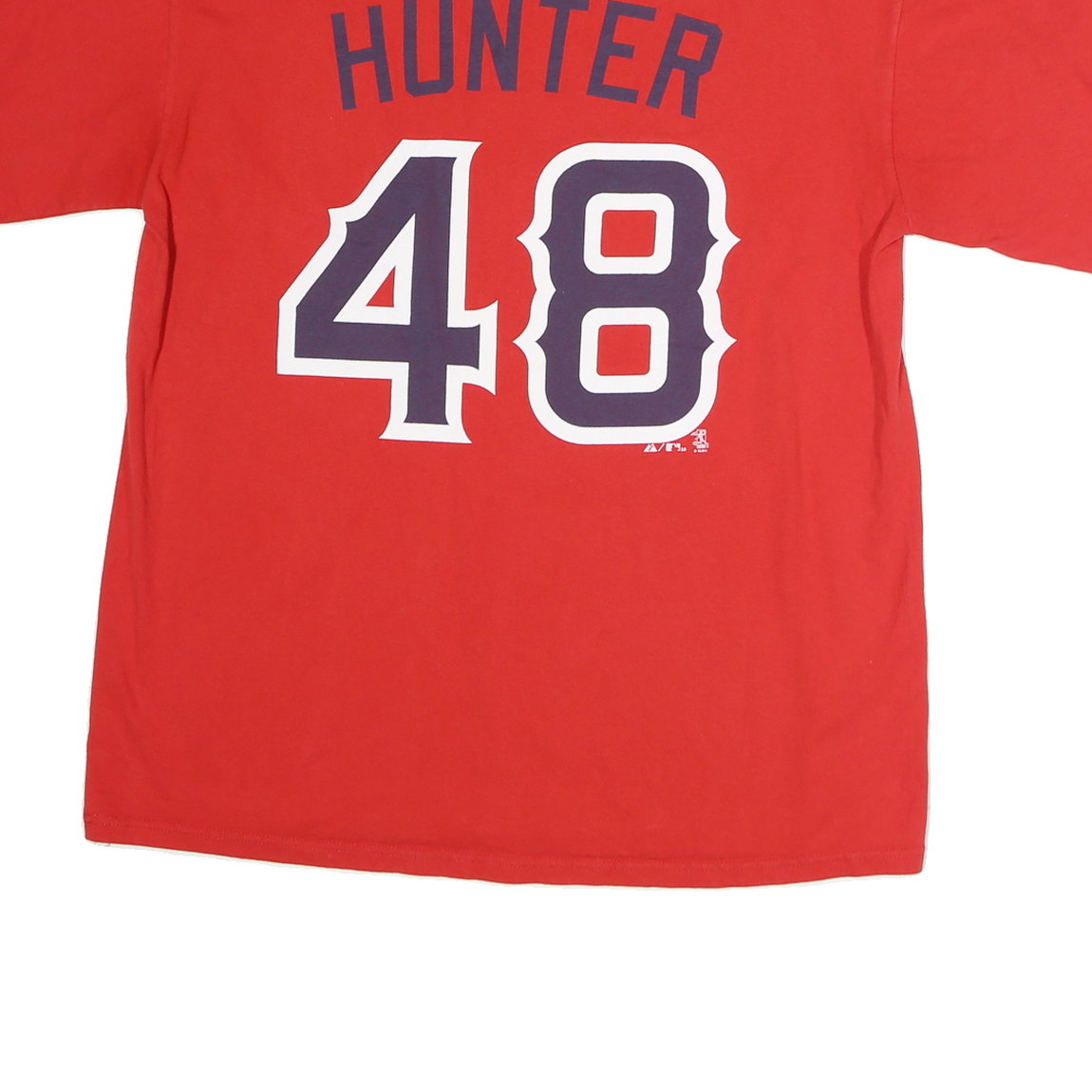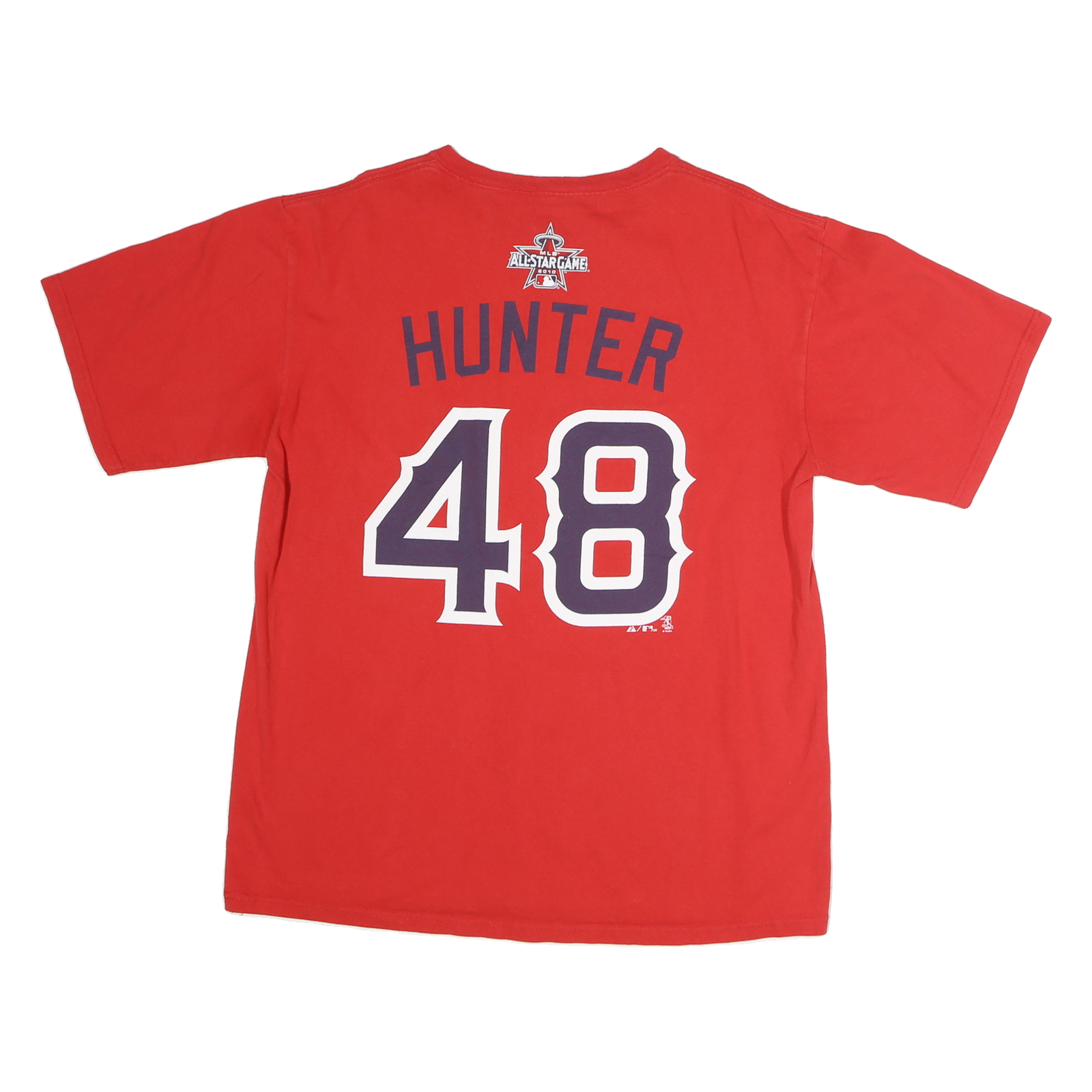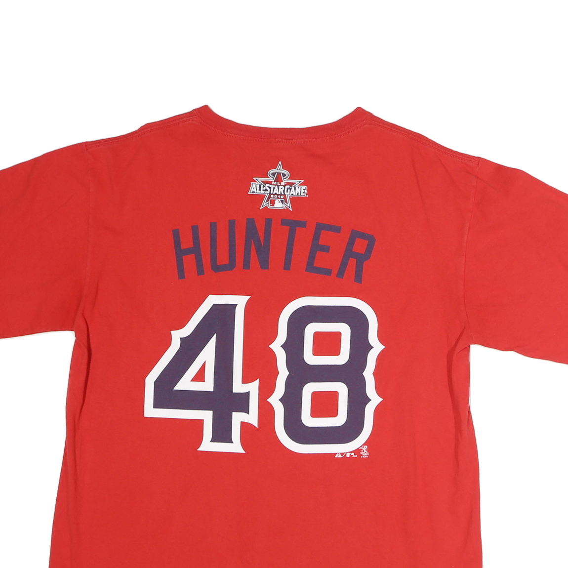 This Majestic Mens T-shirt in vibrant red features a bold "American" graphic emblazoned across the front in white and navy with yellow highlights, embodying a sporty and casual style. The back showcases "Hunter 48" printed in large navy and white numbers and letters, along with a detailed MLB All-Star Game 2010 logo just below the neckline.