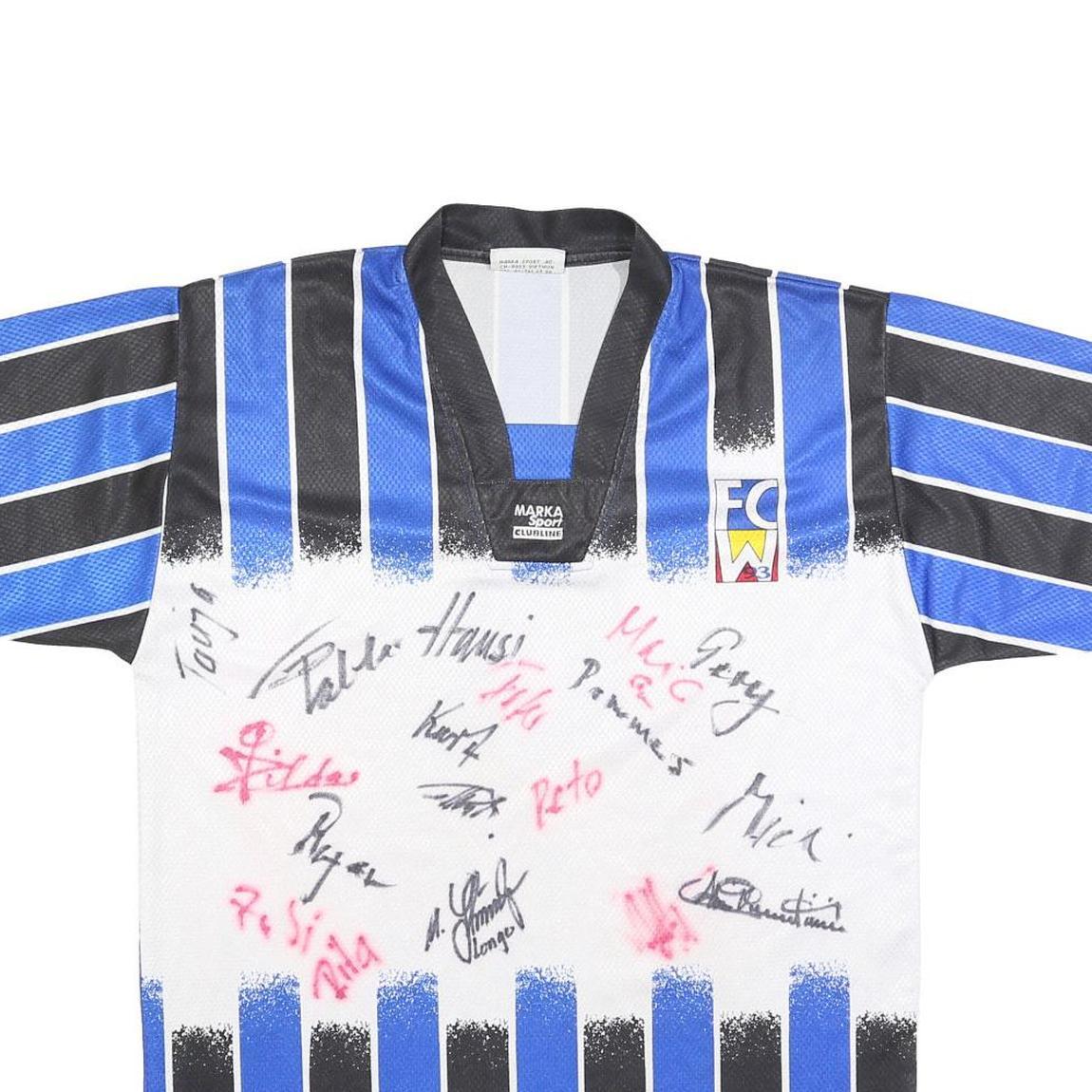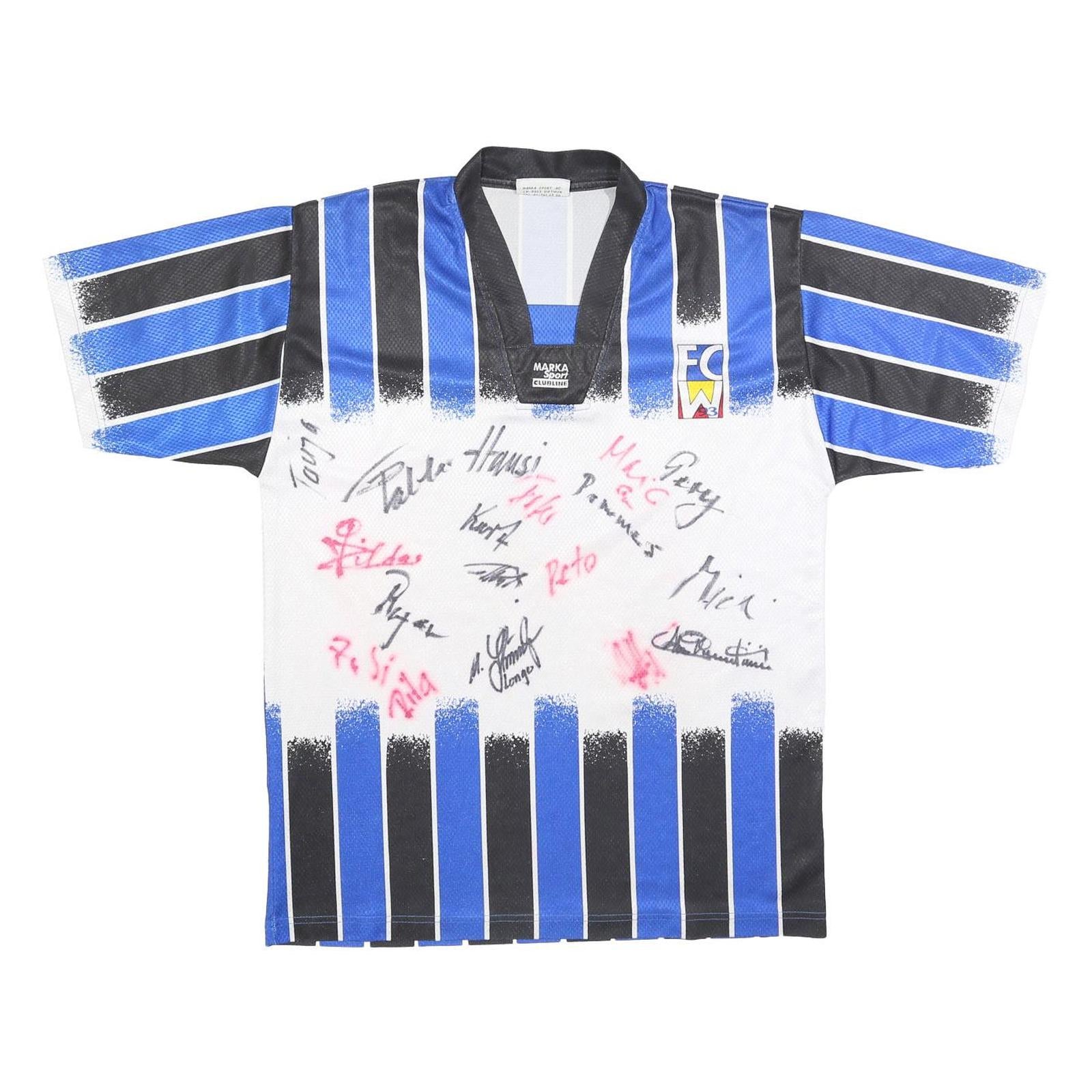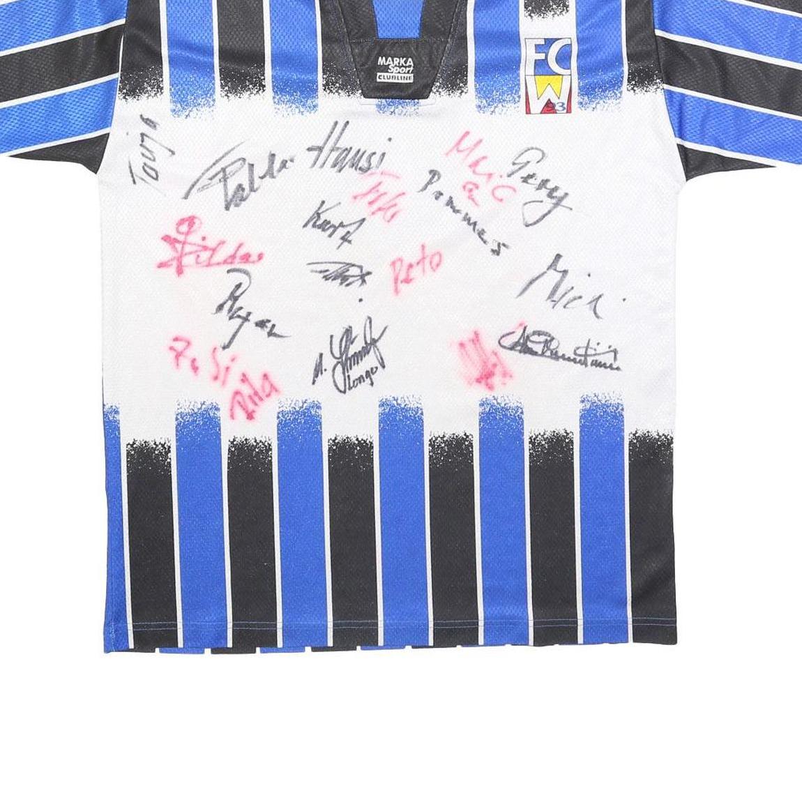 This MARKA SPORT mens football shirt features a striking blue and black vertical striped design crafted from lightweight polyester jersey fabric. It offers a breathable, comfortable wear suitable for sport or casual use.