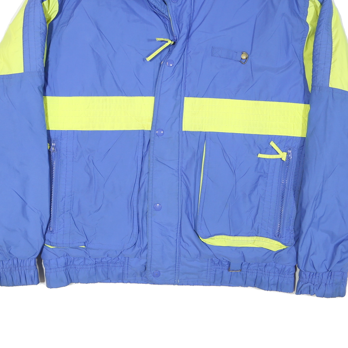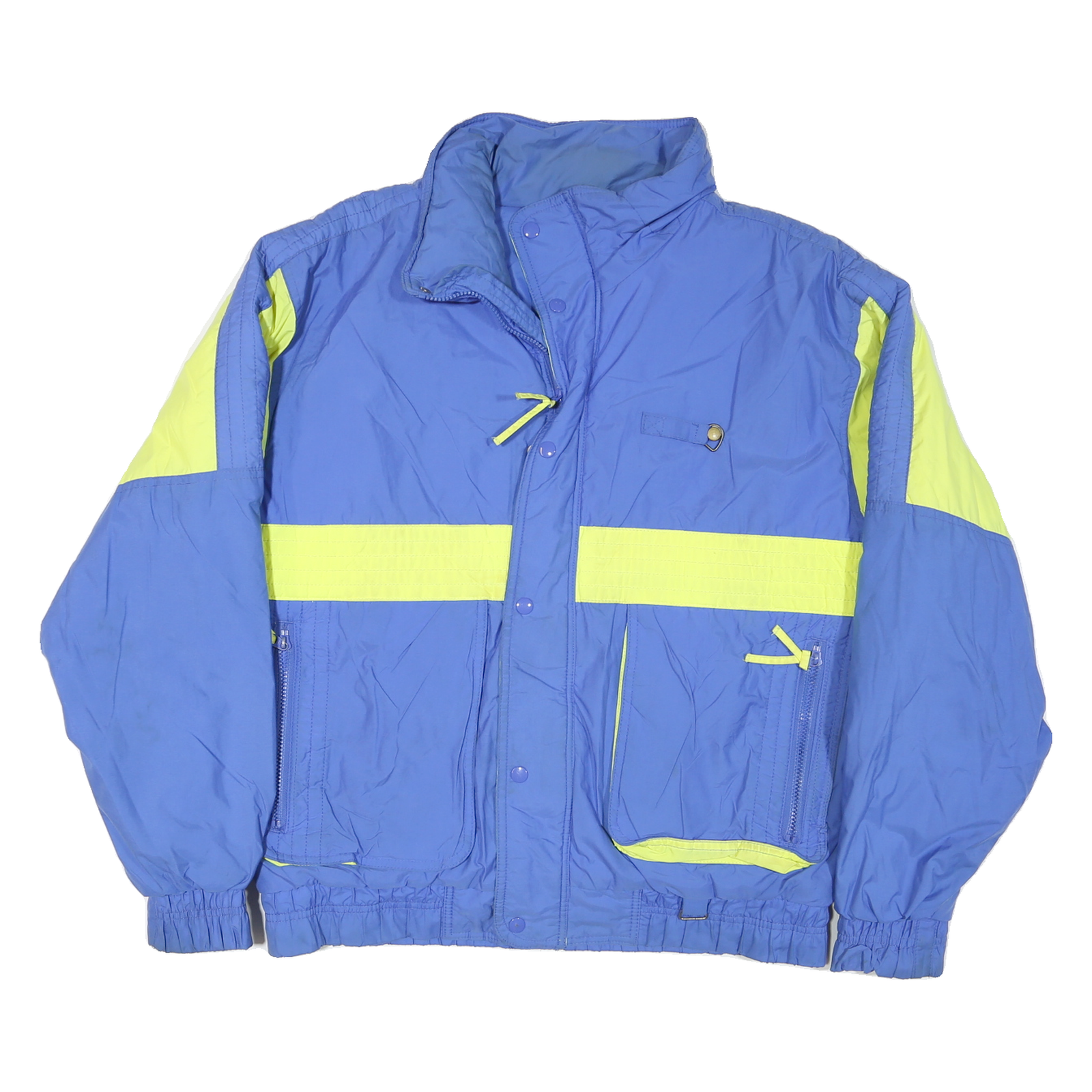 This men's jacket comes in a vibrant blue with contrasting yellow panels on the arms and around the midsection, creating a sporty and retro look. It features a high collar for added neck protection and a zip closure concealed beneath snap buttons for secure fastening. The jacket is adorned with elasticated cuffs and hem for a comfortable, snug fit.