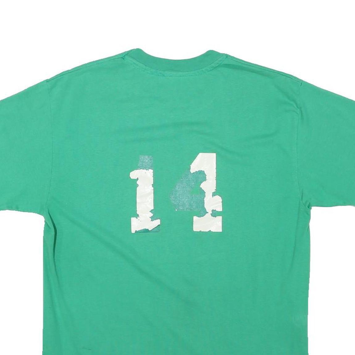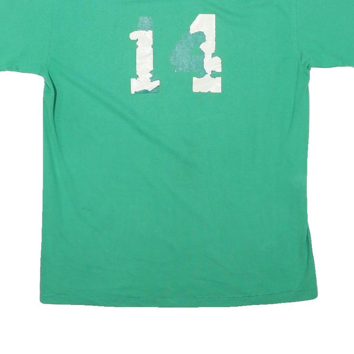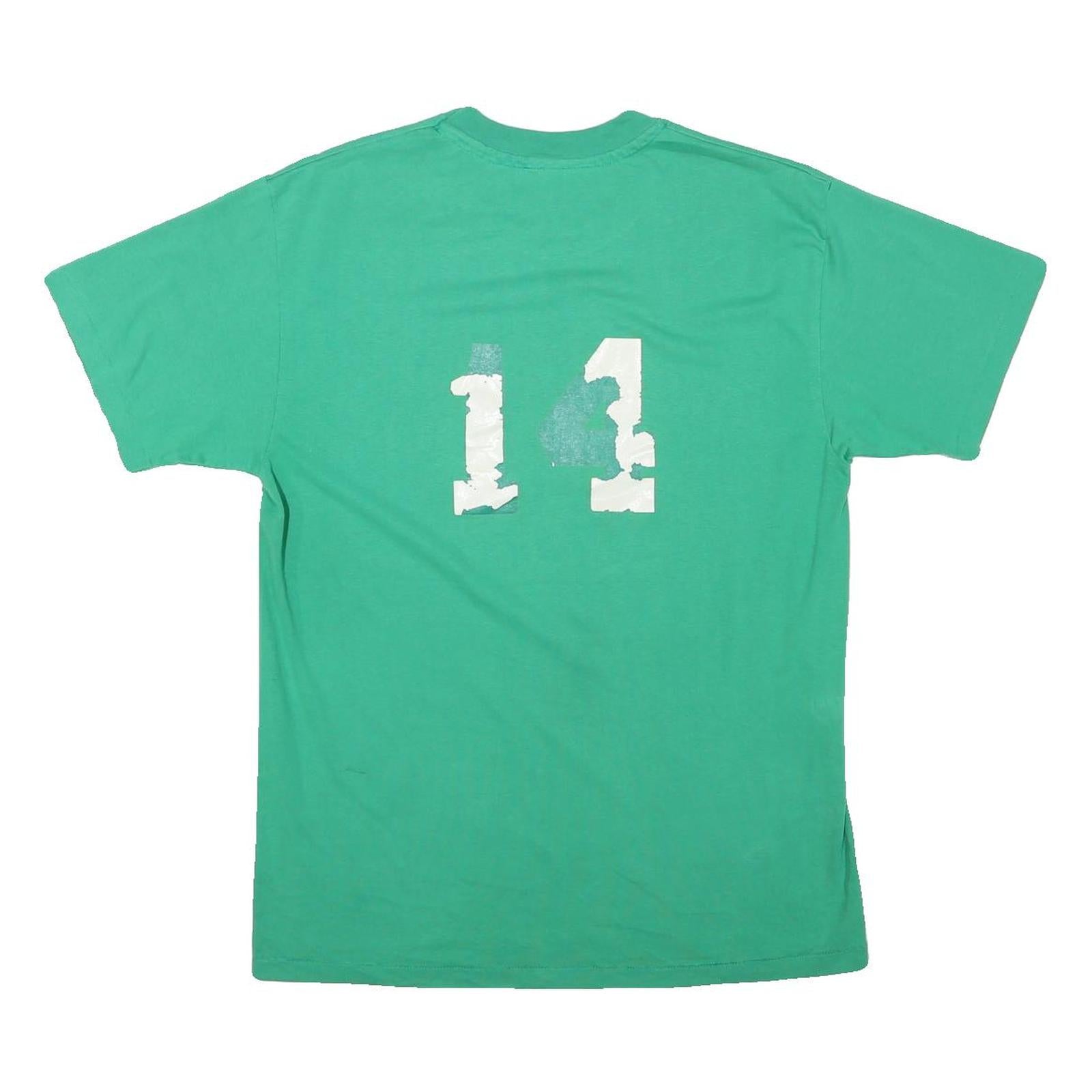 This mens T-shirt features a solid green colour with a bold white printed number '14' on the back. The graphic print is noticeably cracked and slightly faded, adding a vintage character to the item. The front is plain with no additional graphics or branding.