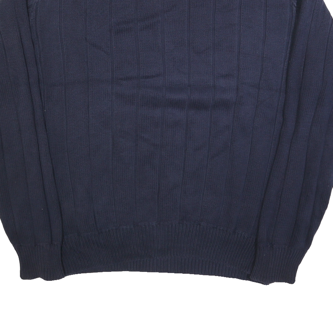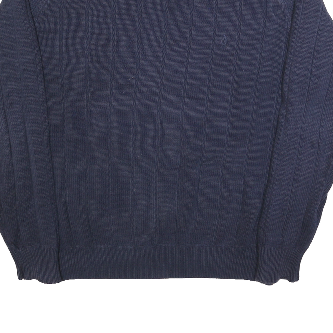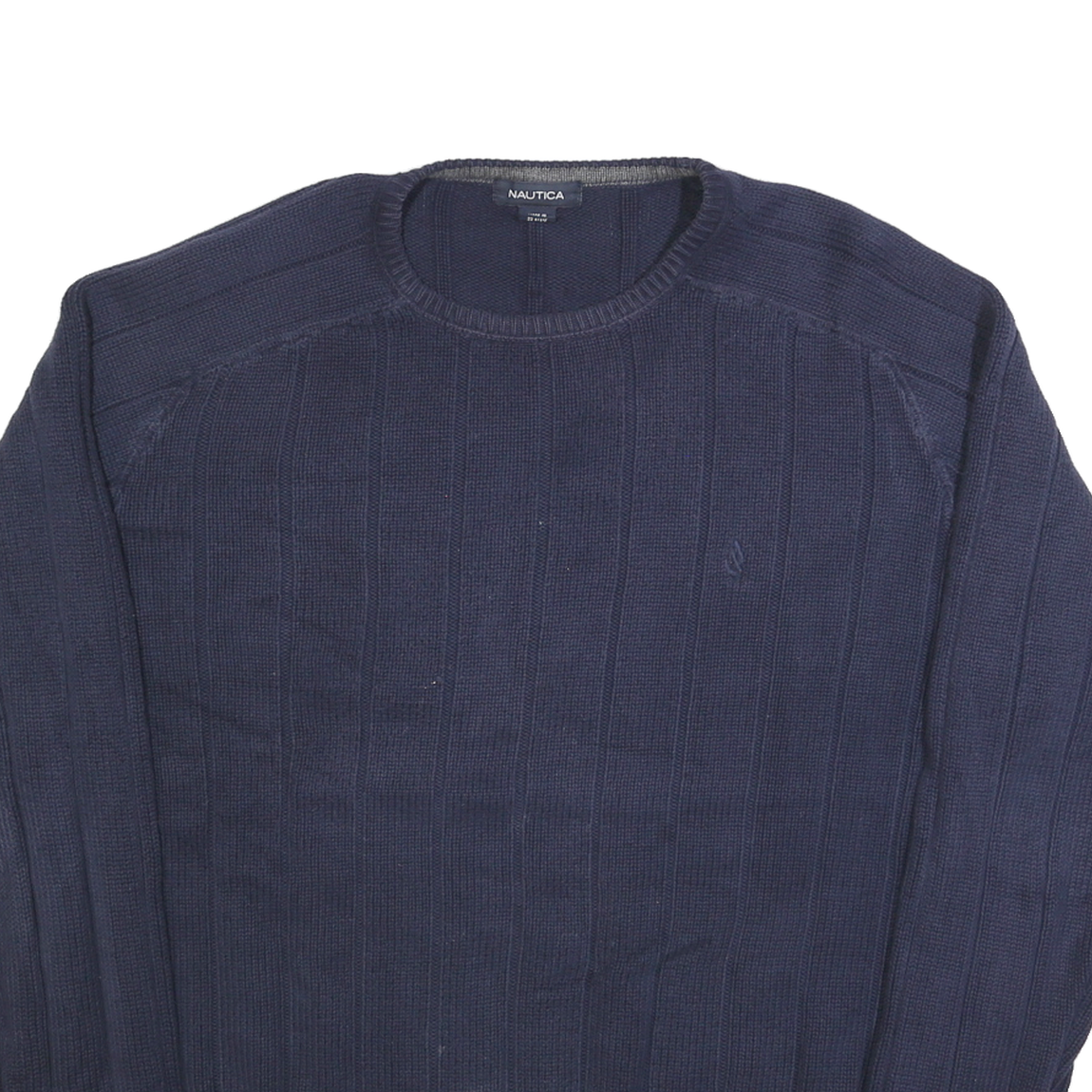This Nautica mens jumper features a deep blue colour with a subtle vertical ribbed pattern adding texture and style. The front displays the Nautica signature embroidered logo in matching blue, lending a sophisticated and minimal branding touch.