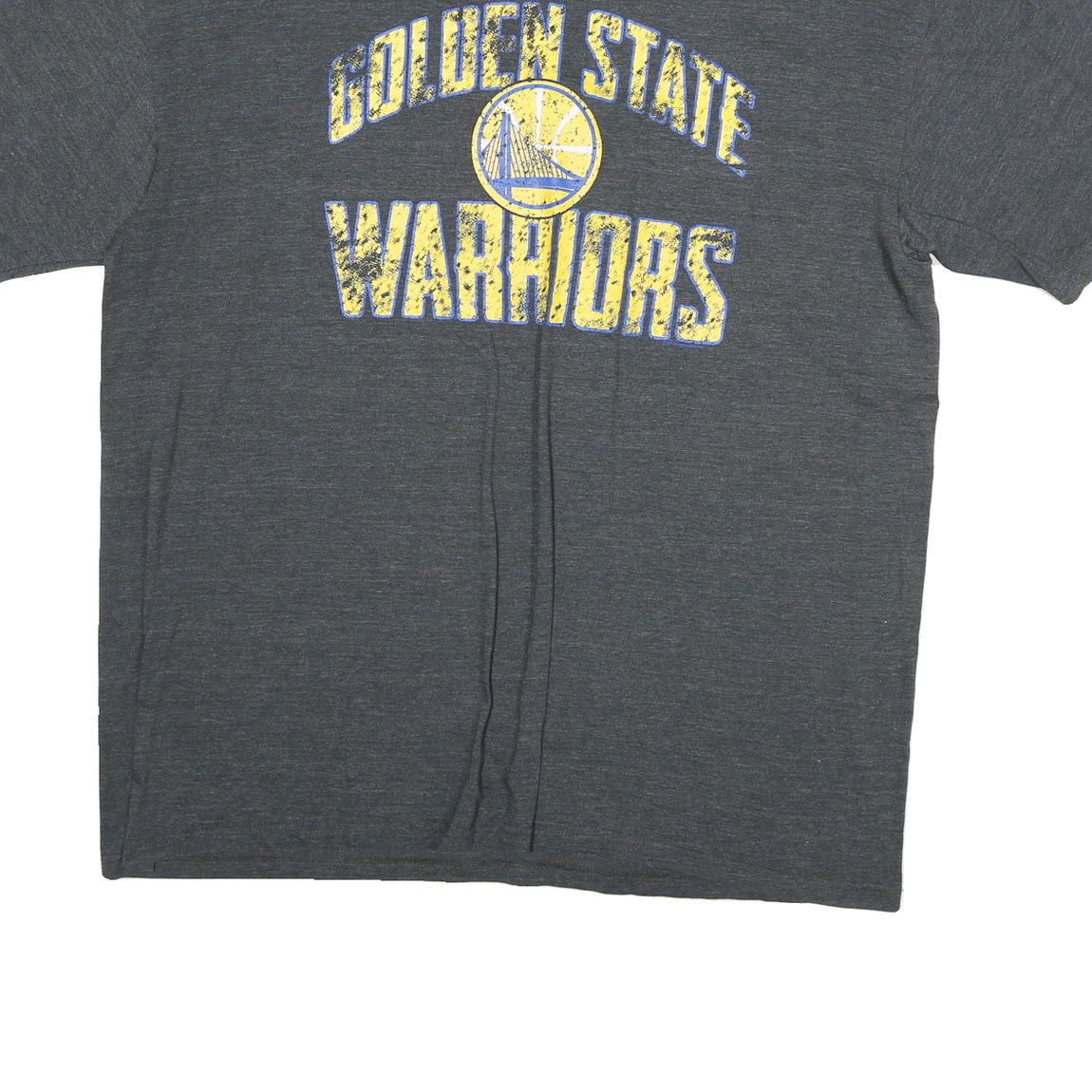 This NBA branded T-shirt features a charcoal grey base with a vintage-style graphic print of the Golden State Warriors text and logo on the front in distressed yellow and blue tones. The print has a worn look adding retro appeal while the rest of the T-shirt is plain.