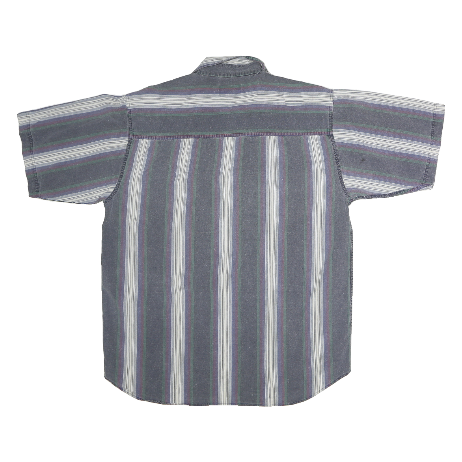 This Neutral Gear mens shirt features a classic striped pattern with blue, white, purple, and green vertical lines. It has a button front fastening and a single chest pocket with button detail. The collar is a traditional point style, complementing the casual look.