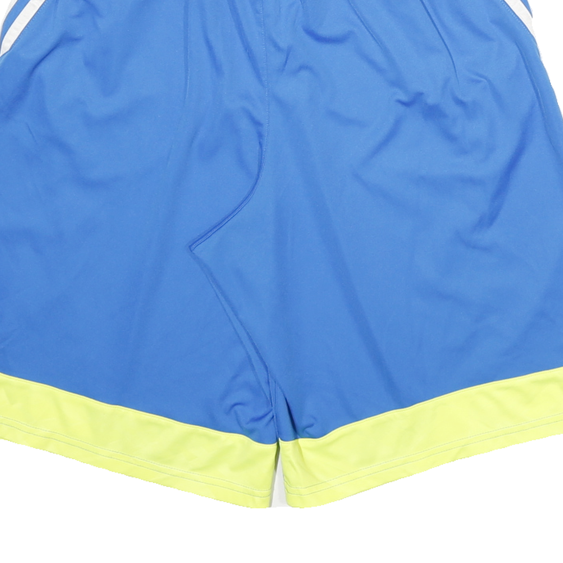 These Nike mens shorts feature a bright blue colour complemented by vibrant yellow accents along the hems and side panels. The shorts display a smooth polyester blend fabric that is lightweight and designed for sports or casual wear. The elasticated waistband ensures a snug fit for comfort and ease of movement.