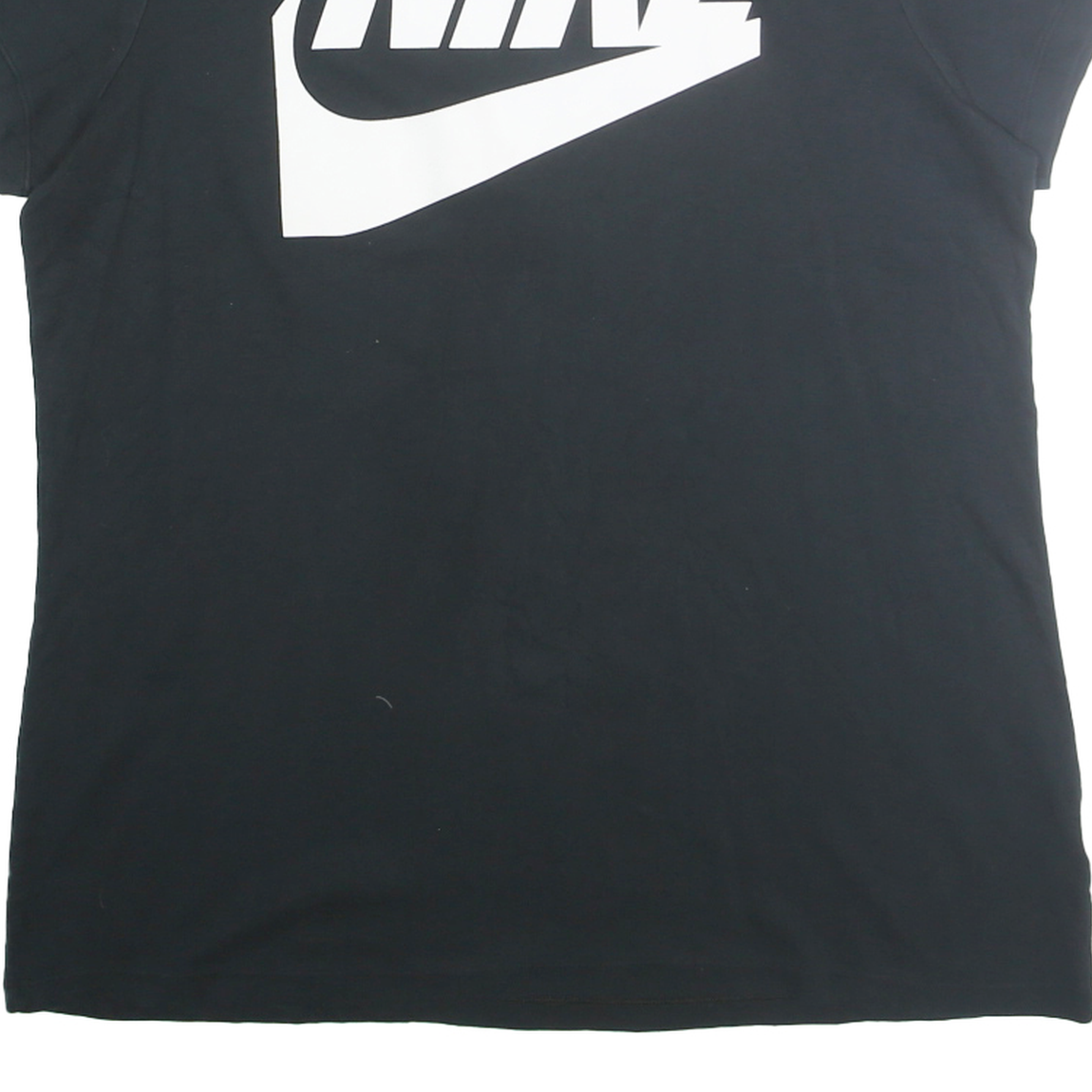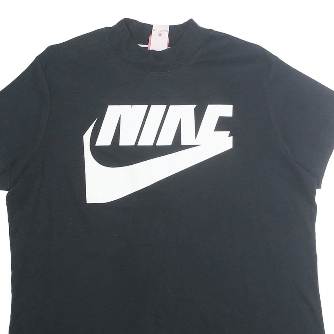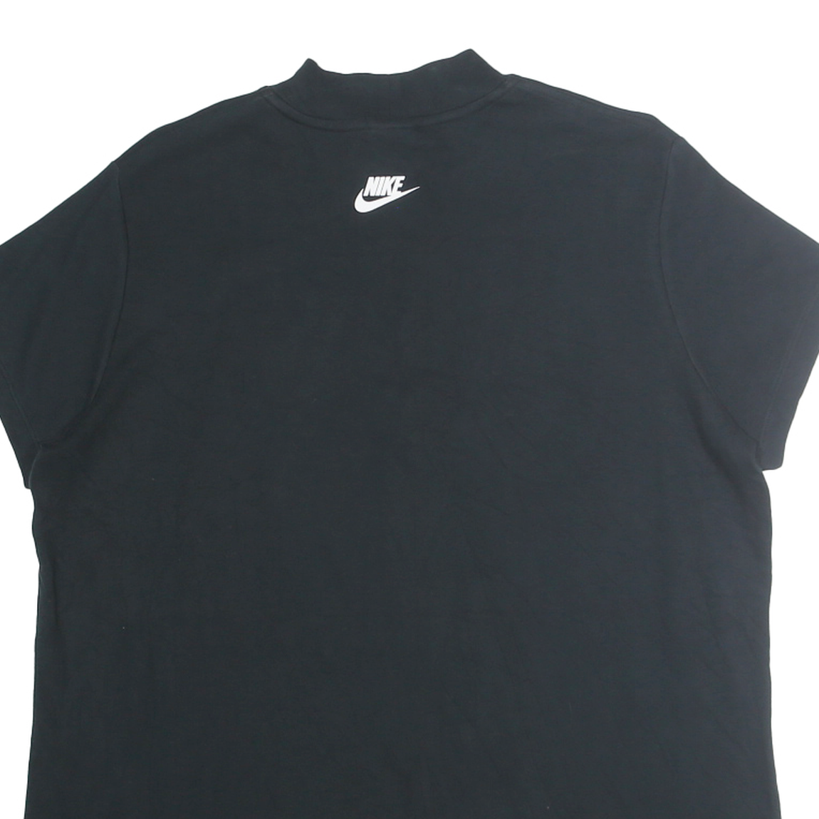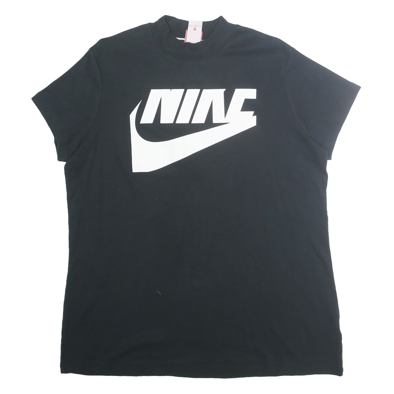 This Nike Womens T-Shirt features a bold white graphic print of the iconic Nike logo on the front, paired with a smaller logo on the upper back. The t-shirt is black, creating a striking contrast with the white branding, making it a stylish statement piece.
