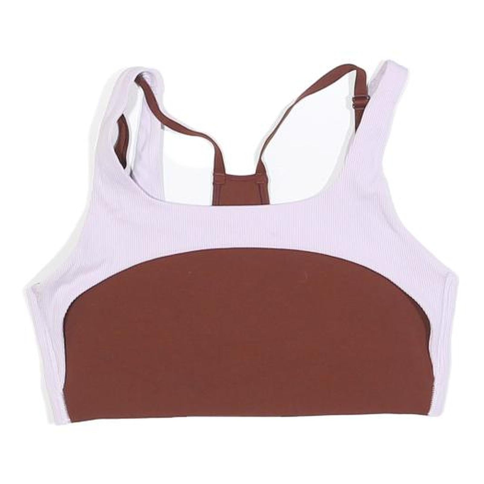 This womens sports top by NIKE features a striking colour block design in brown and white. The front is predominantly brown with white sides, while the back highlights a racerback style in brown with adjustable brown straps and the iconic silver NIKE swoosh logo printed centrally. It is made from a comfortable polyester blend fabric offering stretch and breathability, perfect for athletic activities.