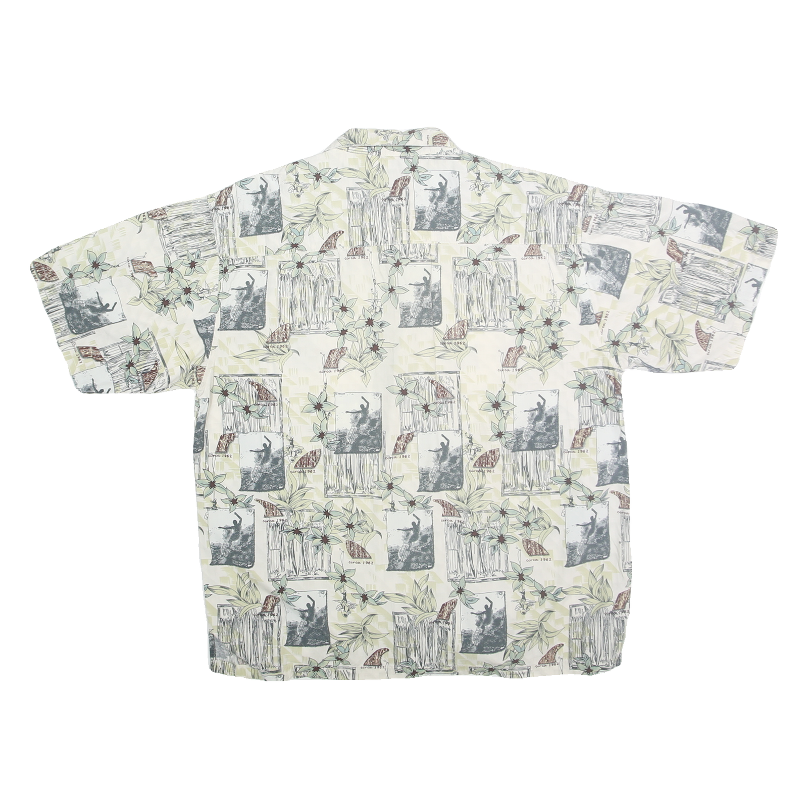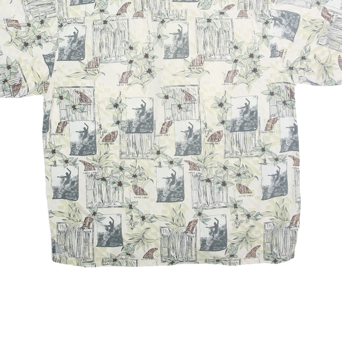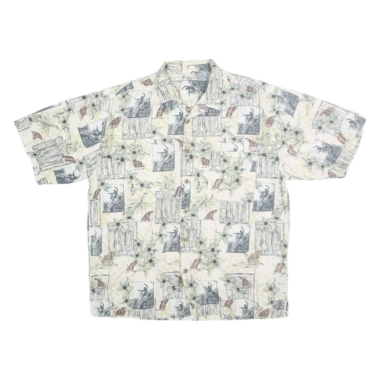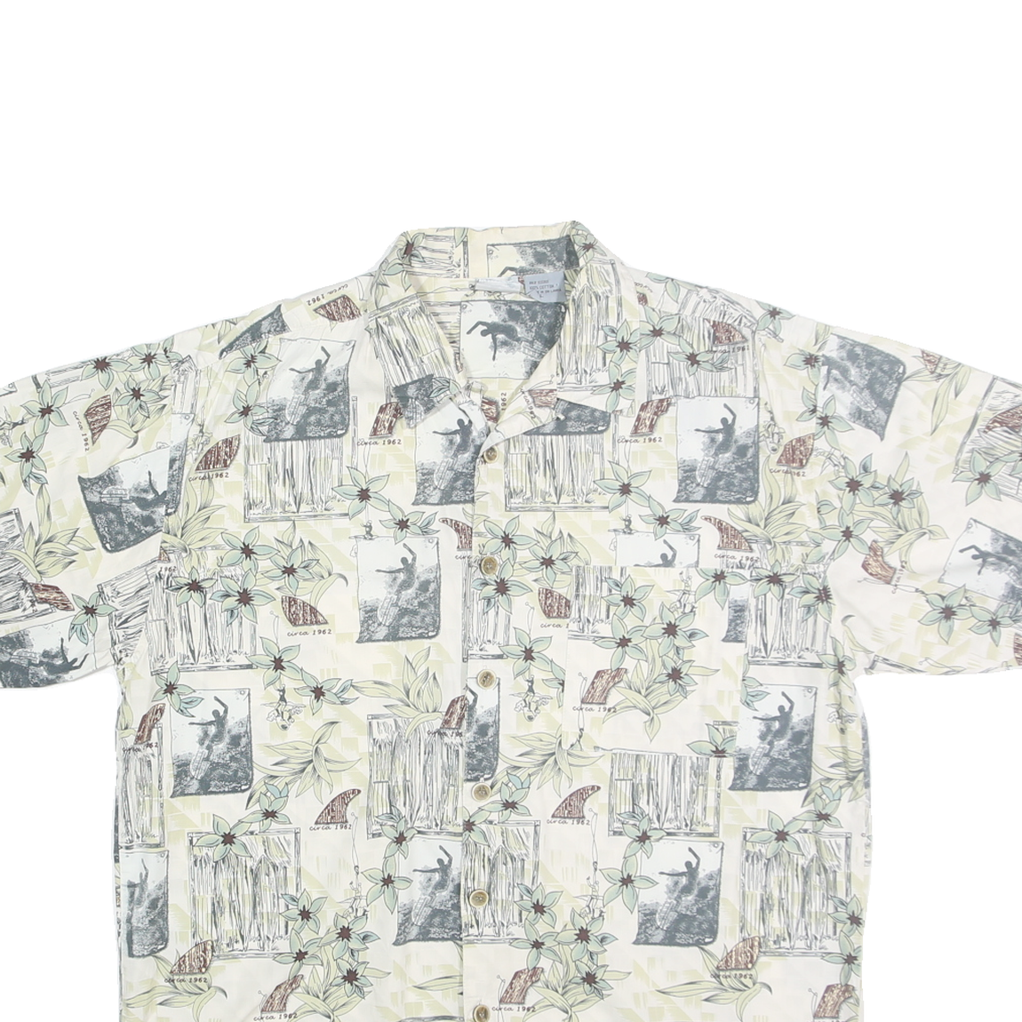 This OP SPORT mens shirt features a light cream base adorned with an all-over tropical print combining floral motifs and vintage-inspired photographs in subtle green, grey and brown hues. The classic button-front design includes a relaxed short-sleeve cut and a soft point collar for easy casual wear.