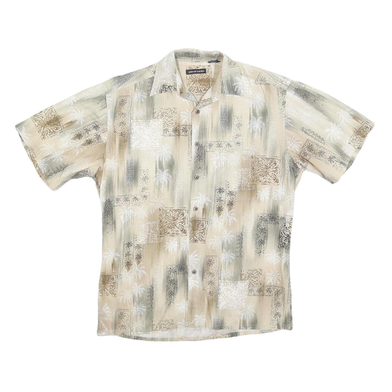 This Pierre Cardin Mens shirt features a beige base with an all-over abstract pattern incorporating palm trees and decorative blocks in subtle white, brown, and grey tones. The fabric has a soft cotton blend composition, offering a comfortable and breathable feel suitable for warm weather.