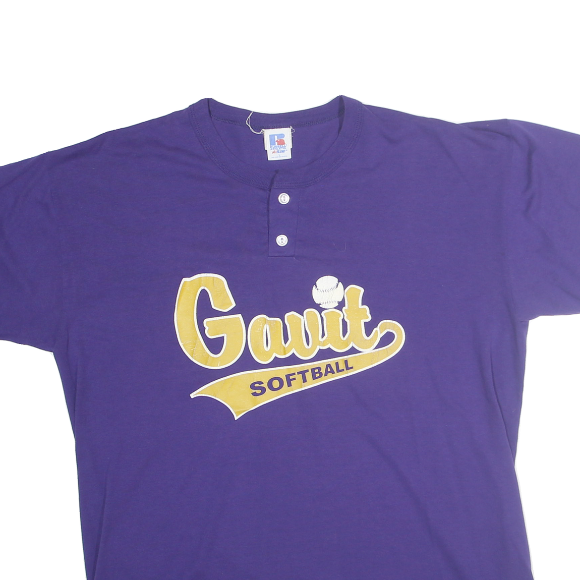 This men's Russell Athletic t-shirt features a rich purple colour with a vintage yellow "Gavit Softball" graphic across the chest, including a small softball icon. The short-sleeve Henley-style tee has a subtle Russell Athletic patch on the left sleeve, enhancing its sporty look. The overall design is simple yet bold, perfect for casual wear or as a tribute to softball enthusiasts.