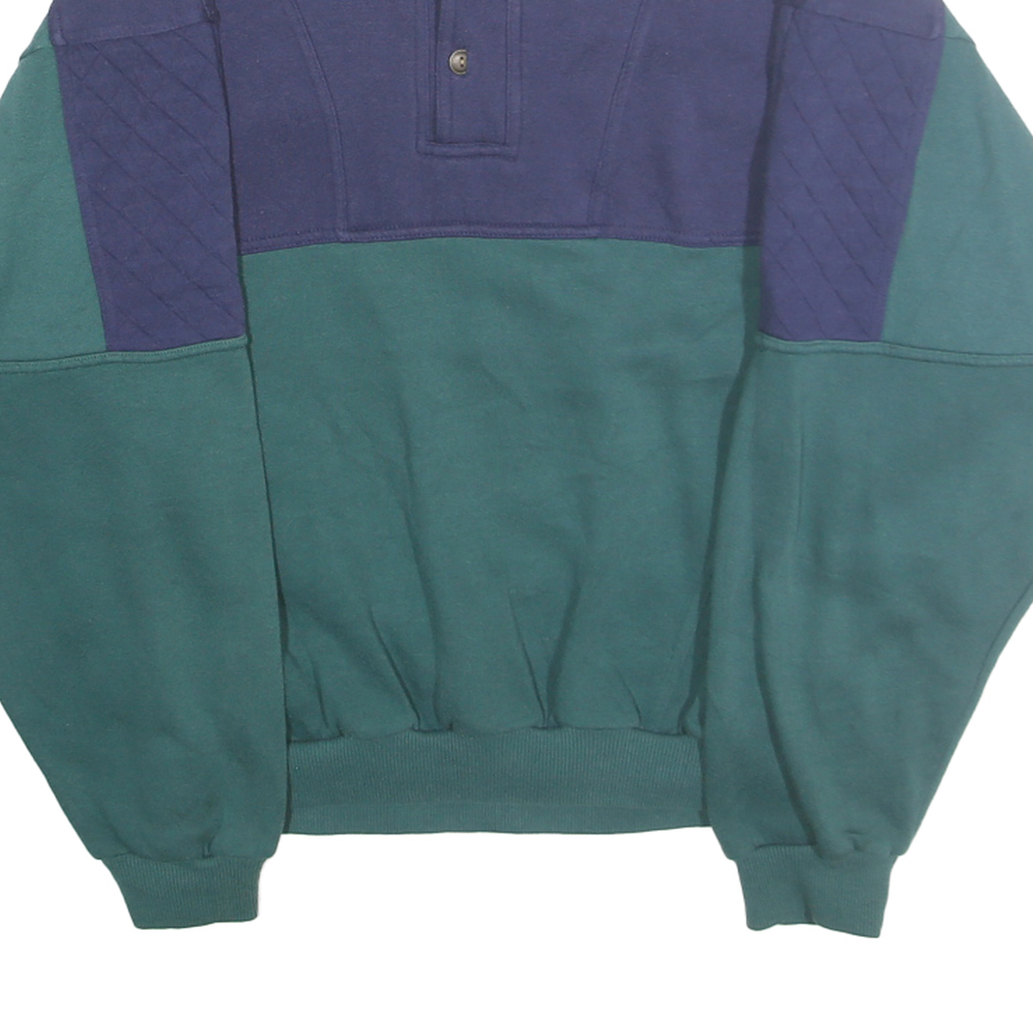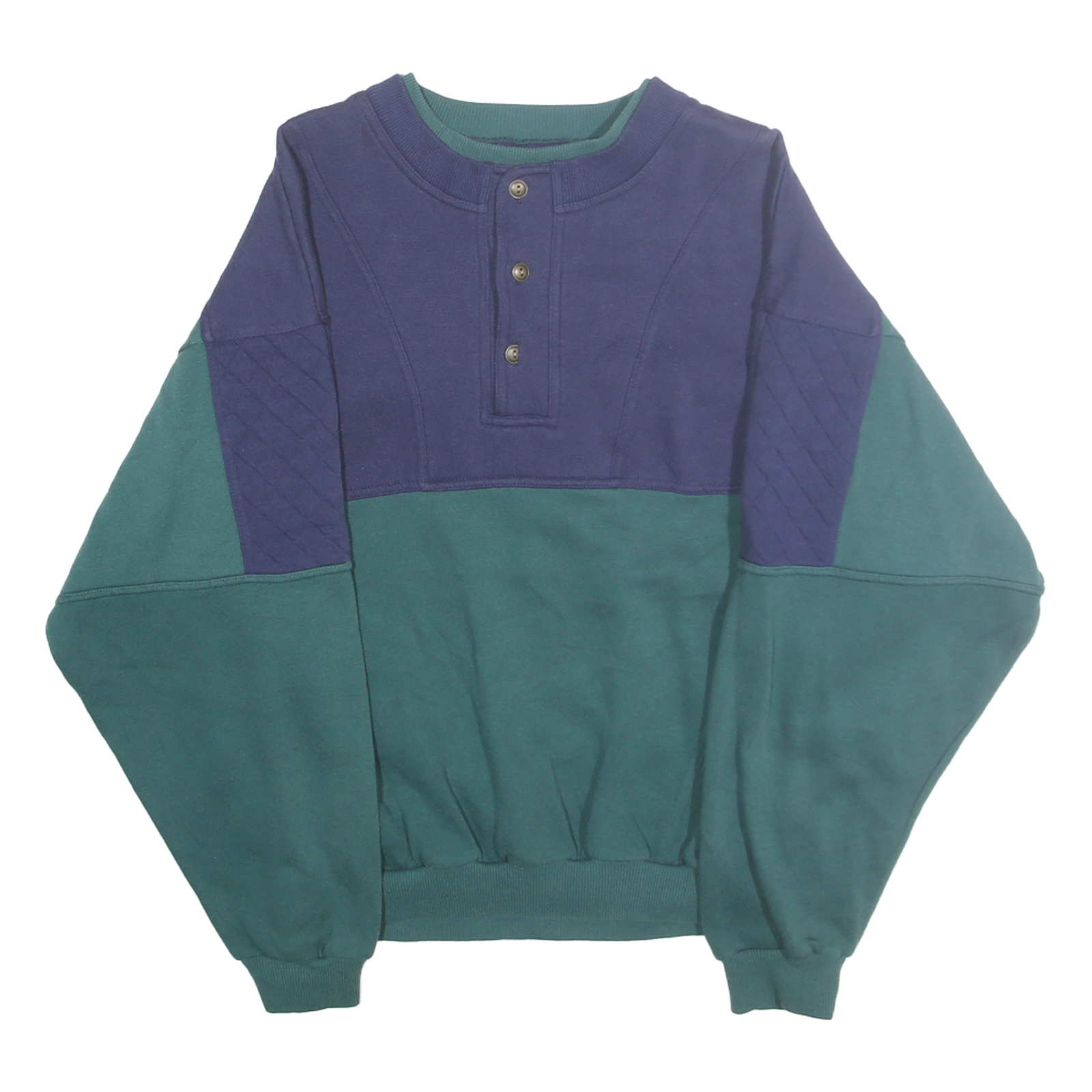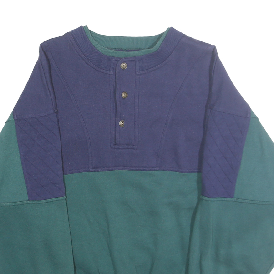 This Sears Roebuck men's sweatshirt features a distinctive colourblock design in blue and green polyester blend fabric. The upper chest and shoulders are accented with blue quilted fabric panels, creating a textured contrast against the green lower body and sleeves. The front has a partial button placket with three metallic buttons, adding a vintage-inspired detail to the crew neck style.