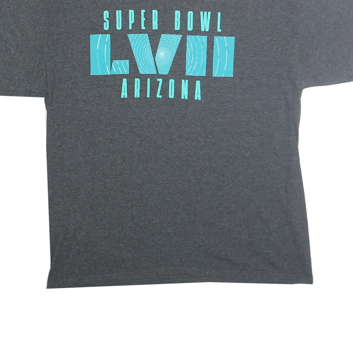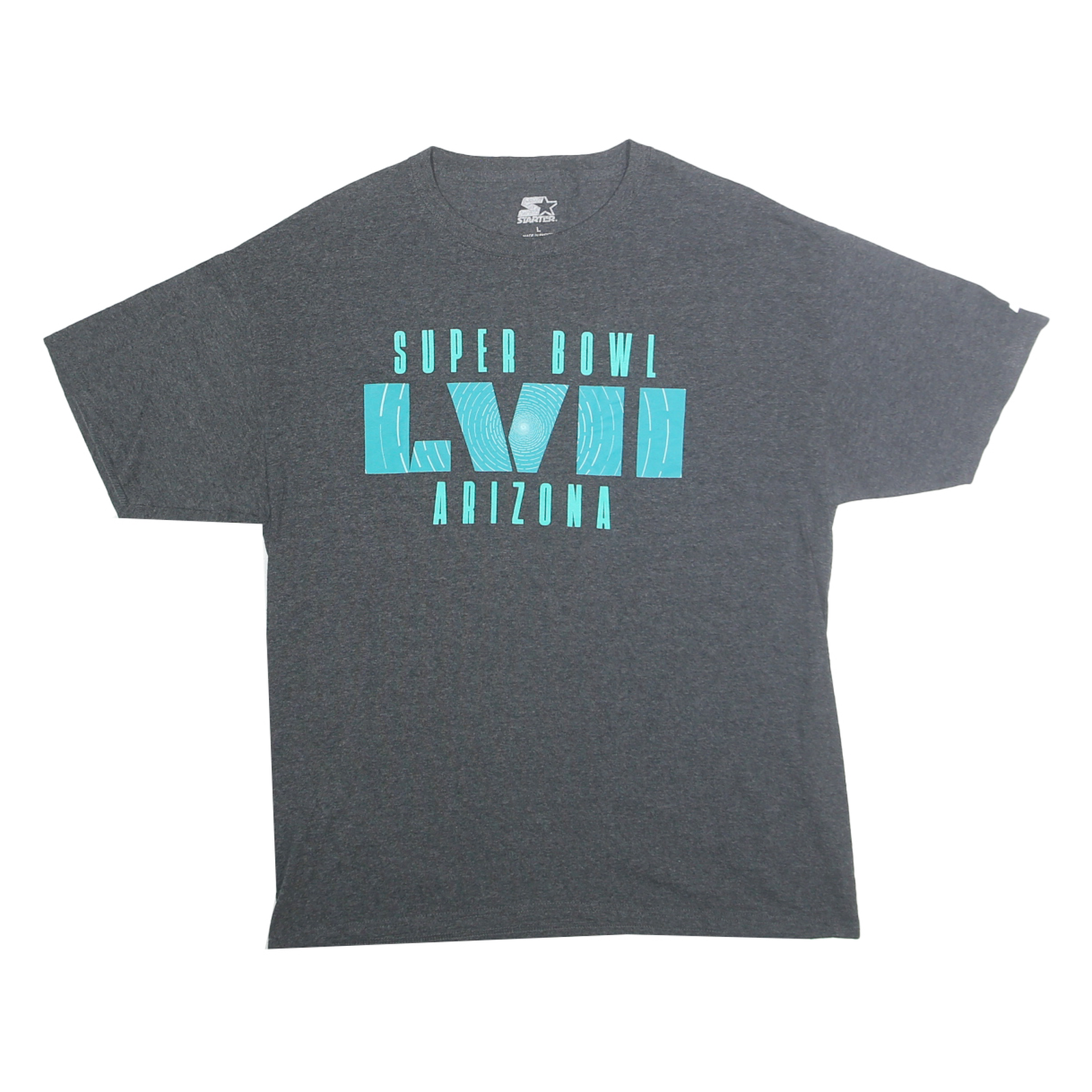 This Mens Starter T-Shirt is made from a comfortable cotton blend fabric in a solid grey colour. It features a bold turquoise graphic print on the front centre with the text "Super Bowl LXVII Arizona" in striking block letters and numbers. The Starter logo is subtly printed on the inside neck and on the left sleeve.