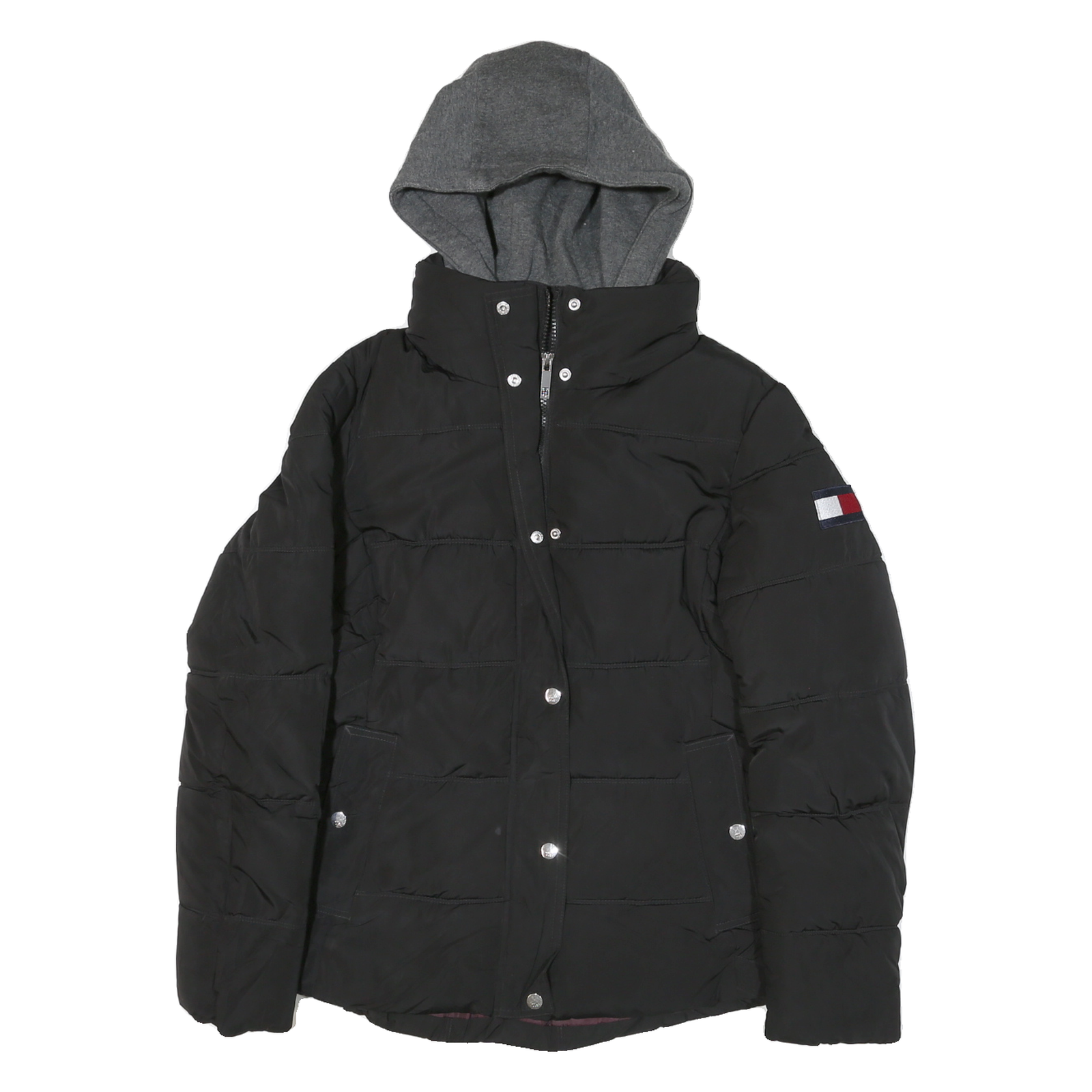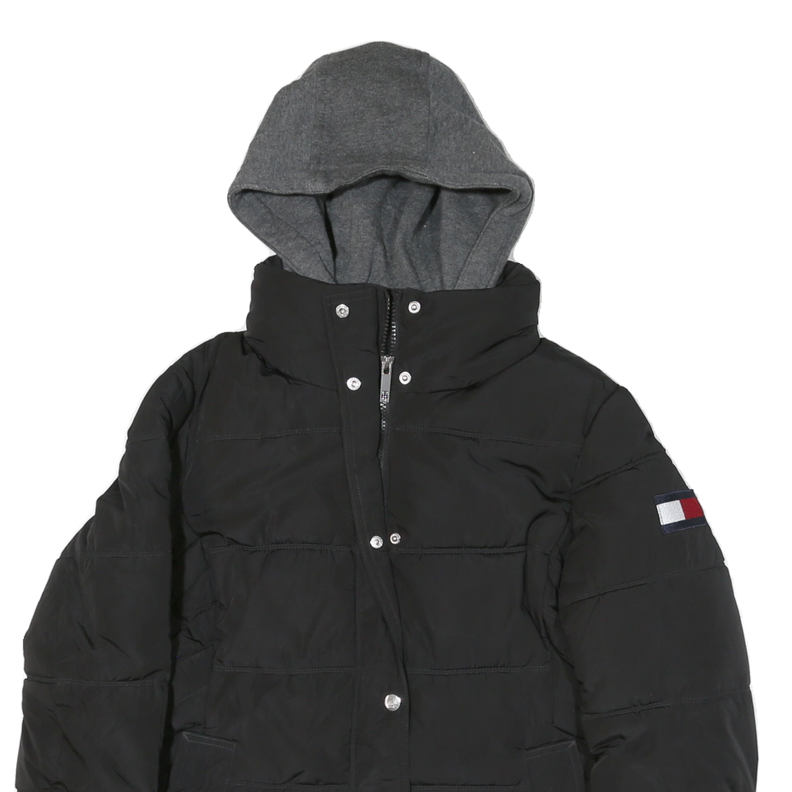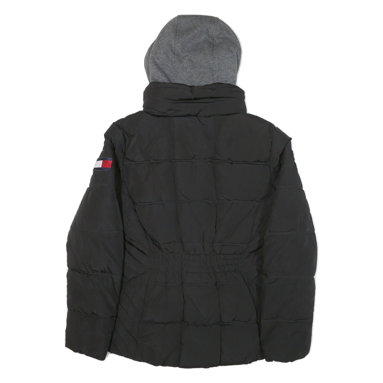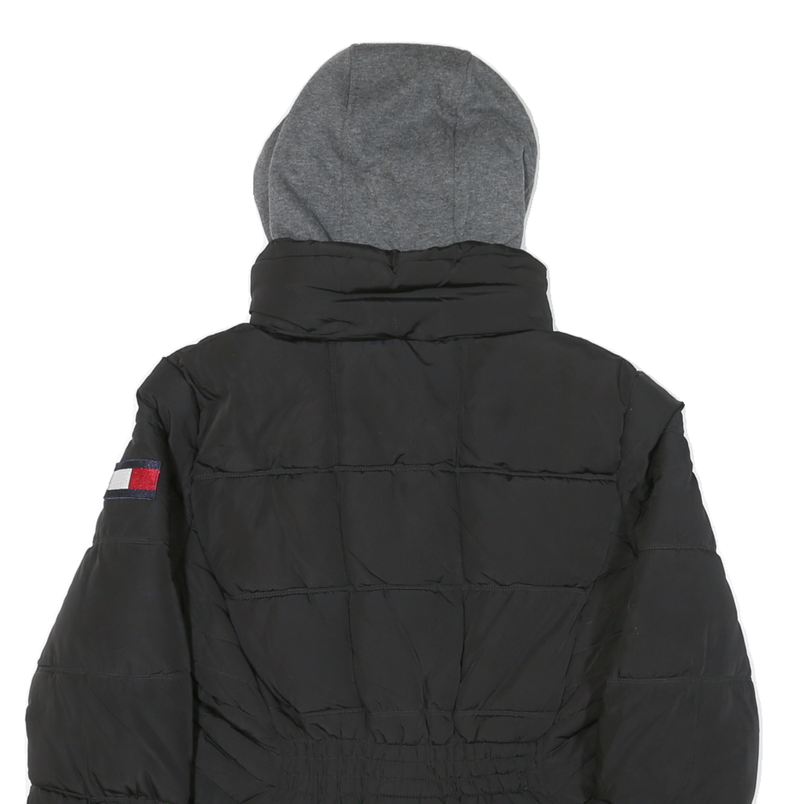 This womens Tommy Hilfiger jacket is primarily black with a distinctive grey hood attached, creating a classic layered look. The jacket features visible quilted stitching across the body and arms, adding texture and warmth. The Tommy Hilfiger logo is proudly embroidered on the left sleeve, highlighting its brand authenticity.
