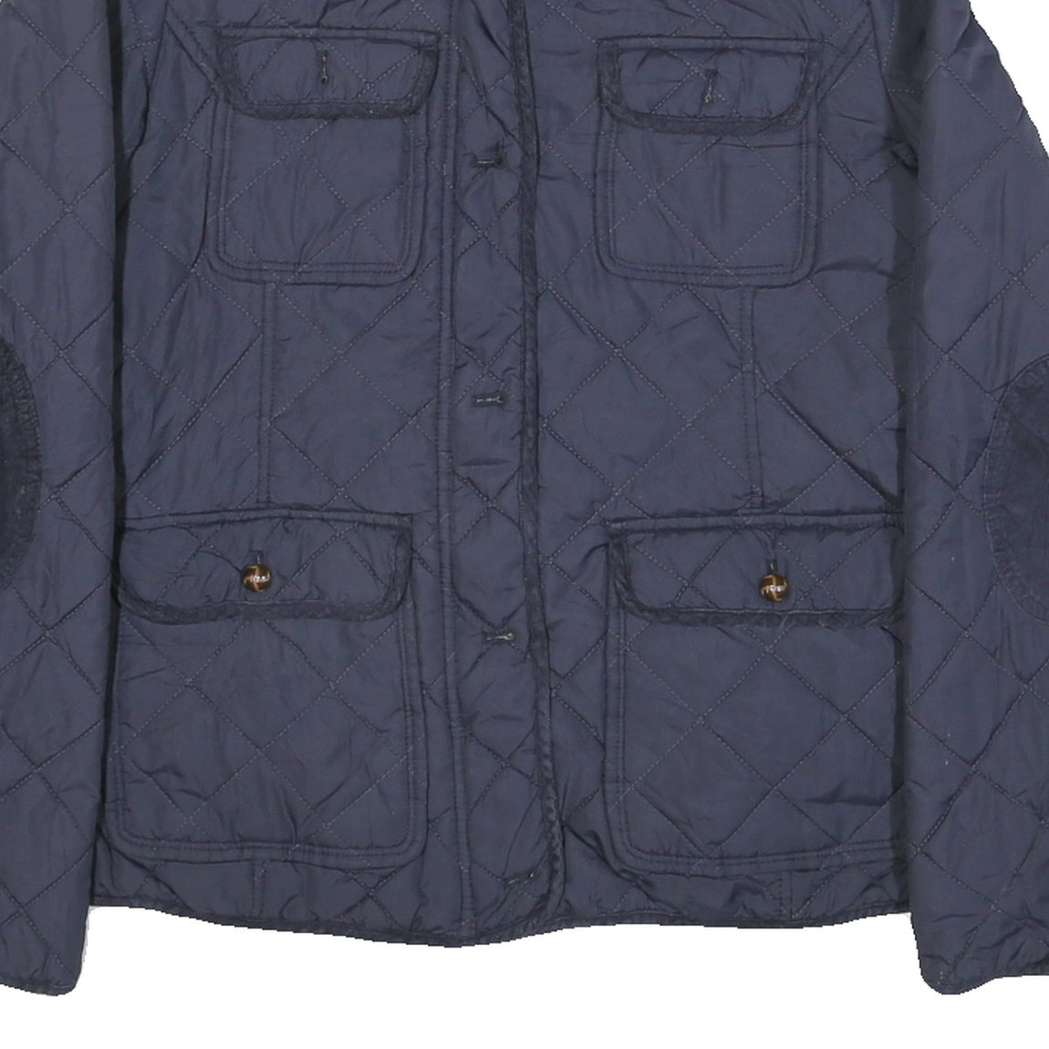 This Tommy Hilfiger womens jacket features a classic quilted design in a deep navy blue shade, complemented by contrasting corduroy patches on the shoulders and elbow areas for added texture and durability. It includes practical multiple flap pockets on the front, each secured with buttons or zips, adding both style and functionality.