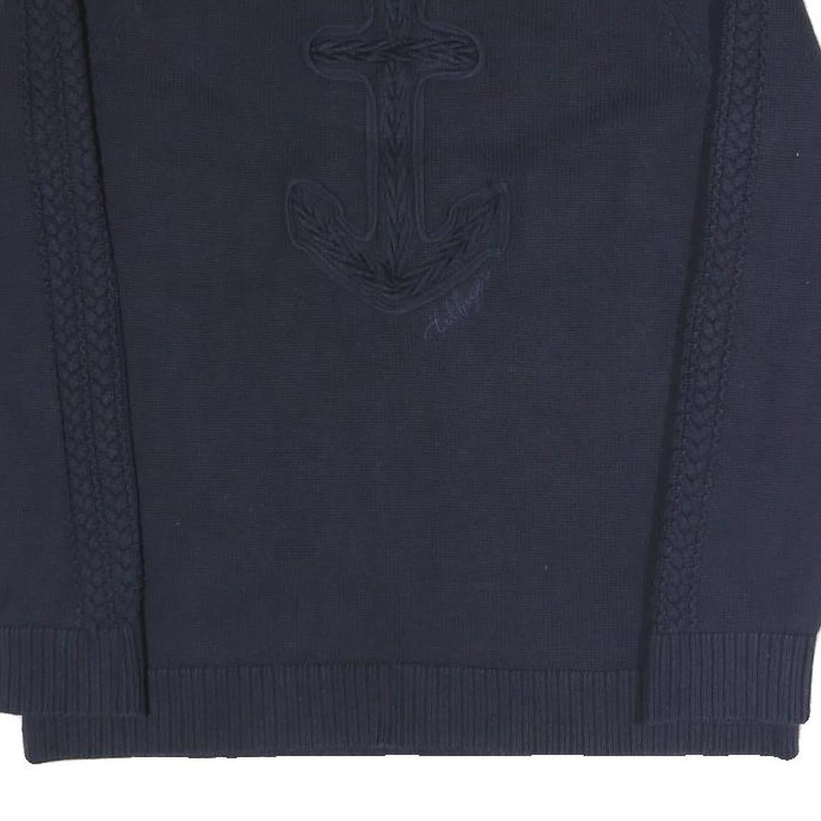 This Tommy Hilfiger womens jumper is crafted in a deep navy colour with a subtle anchor motif embossed on the front, lending a nautical-inspired detail without overt branding. The jumper features cable knit paneling down the sleeves, adding texture and interest to an otherwise plain design. The classic crew neck is finished with ribbing, complementing the cuffs and hem for a neat look.